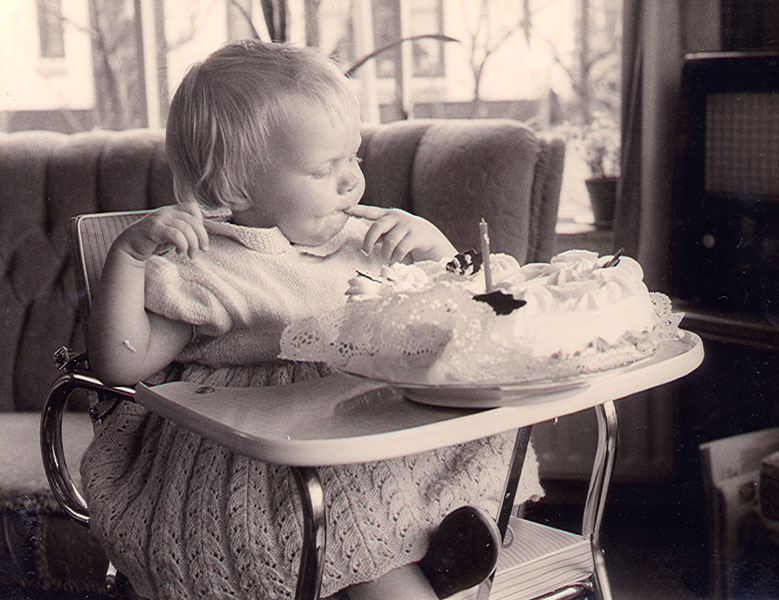 They seems to come from a past life, the baby photos with handknitted dresses. I was always convinced that my grandmother knitted this dress herself, but no, my mother told me that she had it knitted by a Jordanese (oldest neighborhood in Amsterdam) breadknitter. Nice anyway…… My mother also is to be seen in a handknitted dress (photo on the right).
