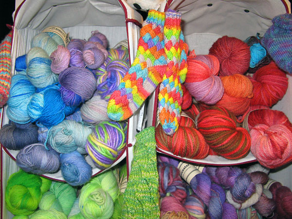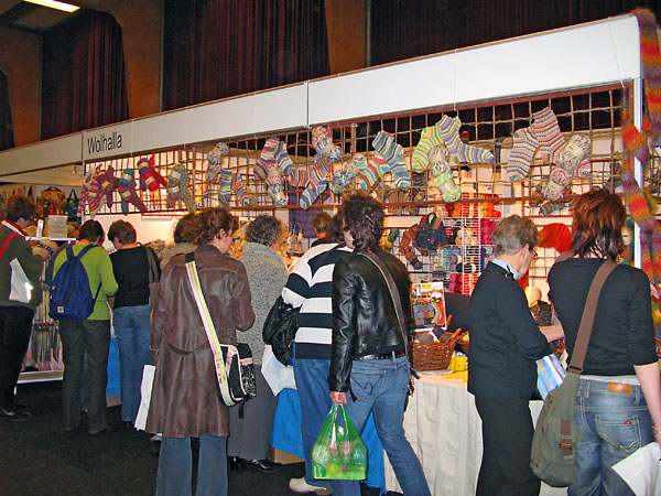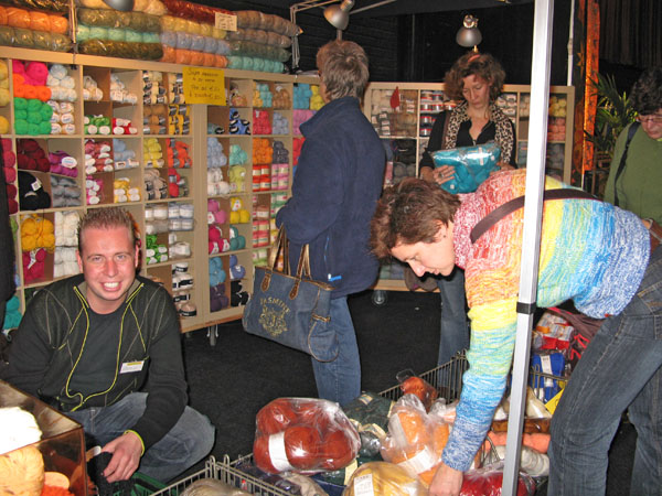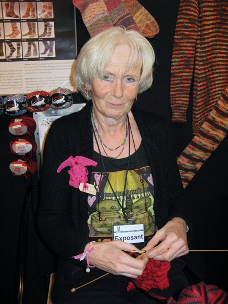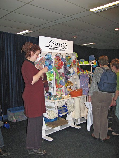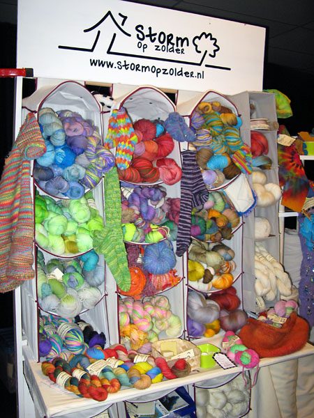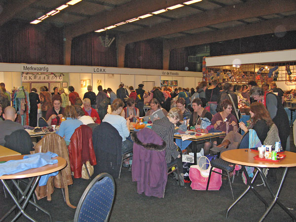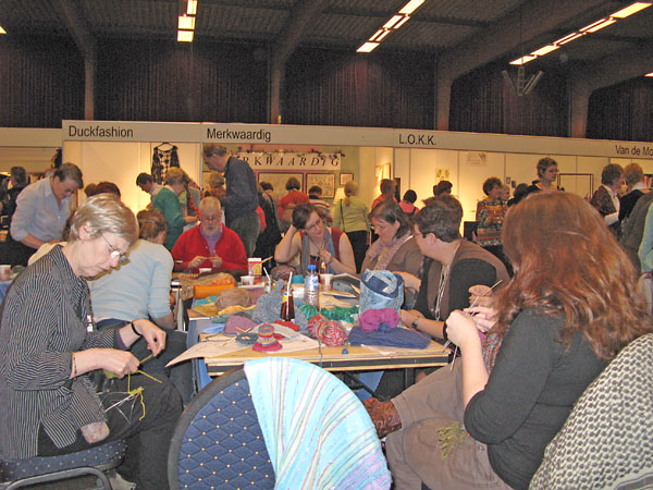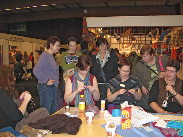 Three days it was happy knitting in the knitting café of the Handwerkbeurs in Zwolle! At a few big tables in the middle of some of our favorite shops (Wolhalla, Drops GarnStudio, Storm op Zolder etc) about 25 Stitch ‘n Bitch’ers have from all parts of the country shown how nice and inspiring knitting together can be. Some visiters brought their own knitting and joined in. Or had Twined Knitting demonstrated to them. Or learned how to knit a sock……..