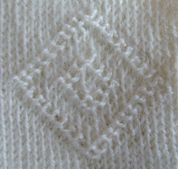 Besides talking, drinking coffee and eating too much and too fat, we knitted of course. Some were interested in the technique of Twined Knitting and I loved telling about it to the public and teaching it to my knitting mates. I made the pink-lilac bag in this technique. That proved that you can also do Twined Knitting on a long circular and make lovely holes and picots. The mittens with red rabbits (who would think of this combination……) are not twined knitting.