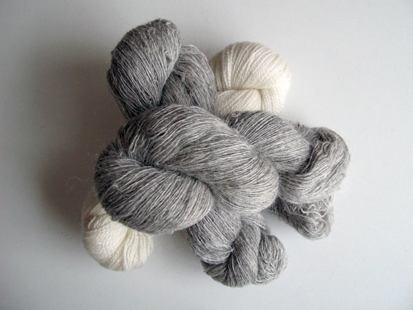 Sirri, that is the trademark of the balls of yarns in a basket on the table of Drops. Tine Jenssen told me that it is from the Faroe-islands. For centuries it is spun and twined in a traditional way. That you can feel. Nice sturdy yarn in natural colors and smelling like lanolin and sheep. Freshly washed sheep, that is! And ‘Sirri, sirri, sirri……’, that’s what the shepards call to gather their sheep. There is untwined thin yarn (right photo), 2ply or 3ply twined yarn, unspun material and a strong yarn (middle photo) that seems to be good for rugs or so. Readymade examples of knitted wool that is felted afterwards proof that hats and bags can be made of it. Btw, if you want to order some from Drops, you will have to be patient, I have bought almost all they had in stock……