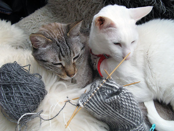 Het Twined Knitting houd me in de ban. Op de foto’s waarop ook poes Dana en haar echtgenoot Peri te zien zijn, zie je een traditionele Zweedse want uit het boek van Ling: Two End Knitting. Het breien is lastig, maar als je de logica ontdekt in het streepjeswerk, wordt het duidelijker. Er is een grote en een kleine duimspie voor extra pasvorm. Doordat je bij het meerderen en minderen bij de spies wel consequent het wisselen van de kleuren kan aanhouden staan als vanzelf de blokjes. Fantastisch, de techniek en functionaliteit van de want vormt de decoratie!