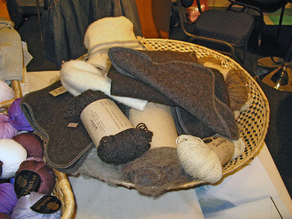 Sirri, dat is het merk van het de knotten garen in het mandje dat op de stand van Drops stond. Tine Jenssen vertelde me dat het afkomstig is van de Faroe-eilanden en al eeuwenlang volgens de traditie gesponnen en getwijnd wordt. Dat voel je. Lekker ruig garen in natuurtinten dat nog ruikt naar lanoline en schaap. Fris gewassen schaap, dát wel! En ‘Sirri, sirri, sirri……’, dat is de roep van de herders als ze de schapen verzamelen. Er is ongetwijnd dun garen (rechter foto), getwijnd met 2 of 3 draadjes, ongesponnen materiaal en een stevig garen (middelste foto) dat me wel geschikt lijkt voor kleedjes of zo. Er liggen voorbeelden van gebreid en vervild materiaal, dus ook mutsen en tassen zijn hiervan prima te vilten. O ja, als je ook wilt bestellen bij Drops, zal je even moeten wachten, ik heb bijna de hele voorraad weggesleept……