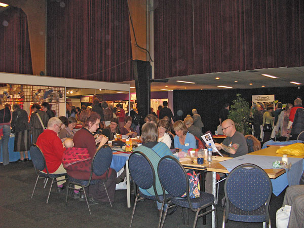 Drie dagen gezellig in het breicafé op de Handwerkbeurs in Zwolle! Aan een paar grote tafels midden tussen onze favoriete leveranciers (Wolhalla, Drops GarnStudio, Storm op Zolder enz) hebben pakweg 25 Stitch ‘n Bitch’ers uit het hele land laten zien hoe gezellig en inspirerend dat kan zijn. Veel bezoekers hadden een breiwerkje bij zich en schoven lekker aan. Of kregen uitgelegd wat Twined Knitting nu precies is. Of leerden een sok breien…….
