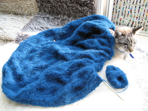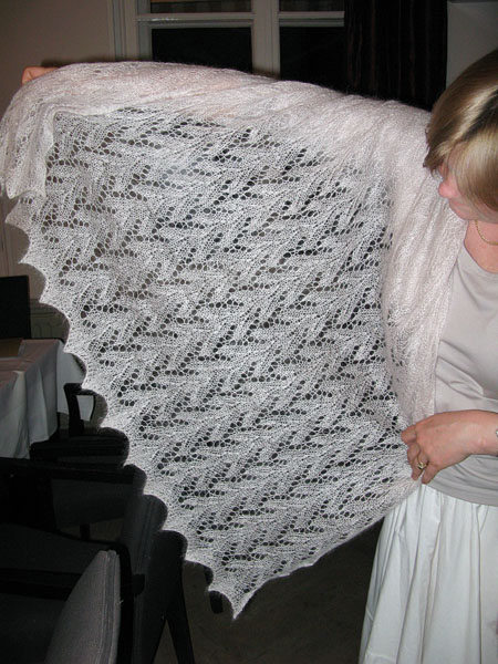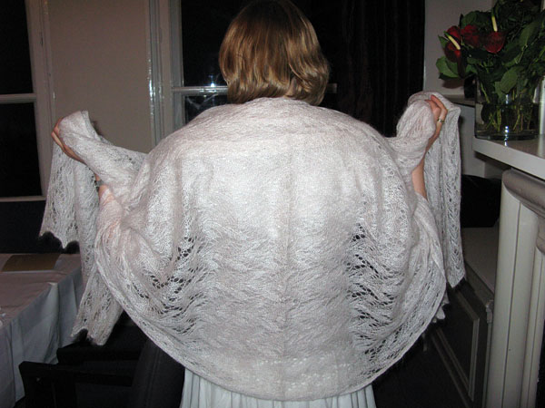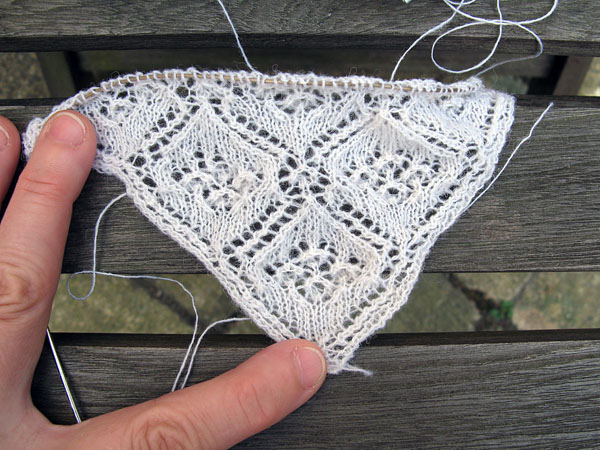 Om altijd iets om handen te hebben, heb ik besloten een lekker moeilijke shawl op te zetten met flinterdun garen op pennen 1,5 mm. Het is de kruising tussen een driehoekige en rechthoekige omslagdoek uit Gathering of Lace geworden. Het streven is om ‘m tegen de winter af te hebben, dus jullie horen hier nog meer over in de loop der tijd. Waarschijnlijk ook veel gezeur over de dunheid van het garen en de ingewikkeldheid van het patroon, ik zal proberen me in te houden…….