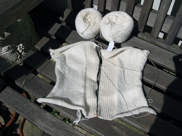 The cute shirt is from Lace Style and I knitted almost both back parts. The 50% silk / 50% merino wool from Verhijde Zijde is very nice for it. The color emphizeses the fact that is designed like a piece of underwear.