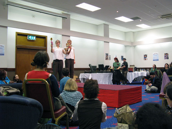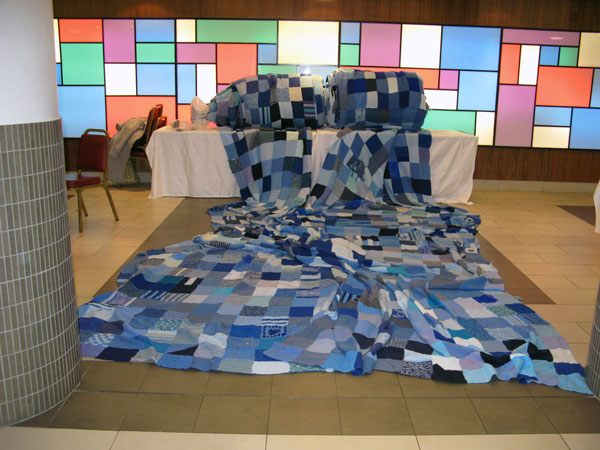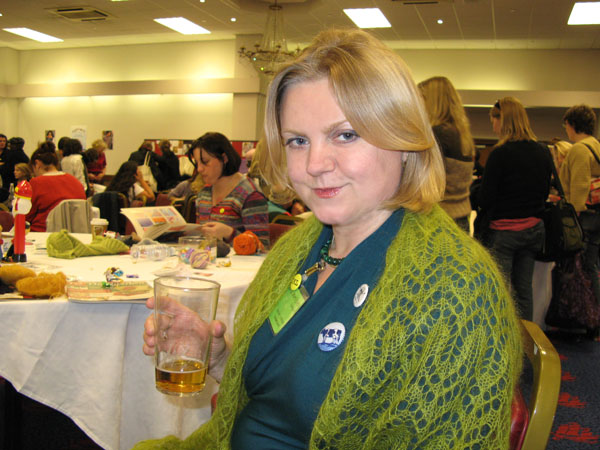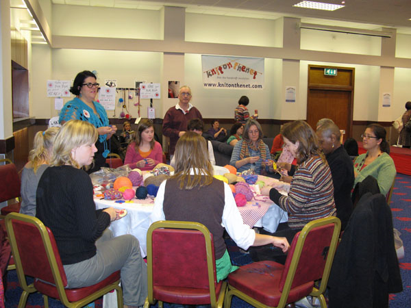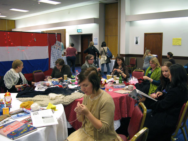 We met Gerard and Craig in the IKnit shop, drunk a cup of tea and went with Craig and his hired bus through the center of London to the hotel where the Day would be next day. Gréat to by so much involved! After a nice Indian buffet and spending the night at Gerard and Craig’s appartment we went early next morning to the Day! With Craig we collected Gerard at Water Aid where he and to gigantic roles of River were waiting along the road. At arrival we already saw Jantine in the hall with a large tray with coffee for everyone. Brent took a nightboot and took his knitted blanket he made for his mother. Corrie took a plane. And unfortunately, Nan got flue at the last moment. Such a bad timing Nanc, next time you are thére, okay!cy