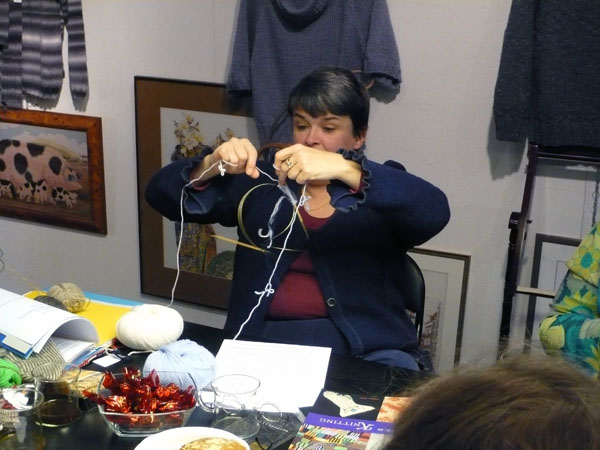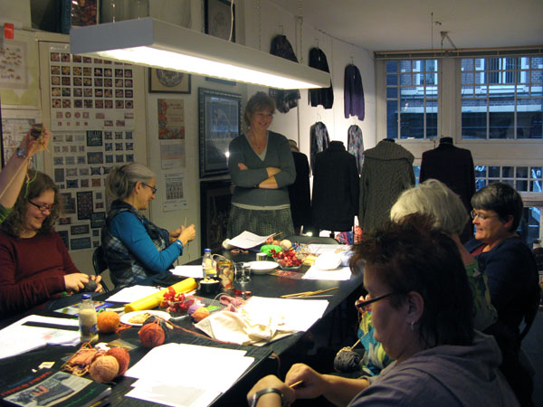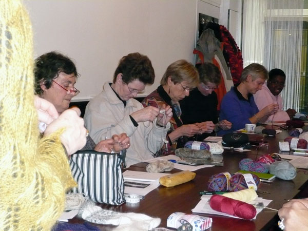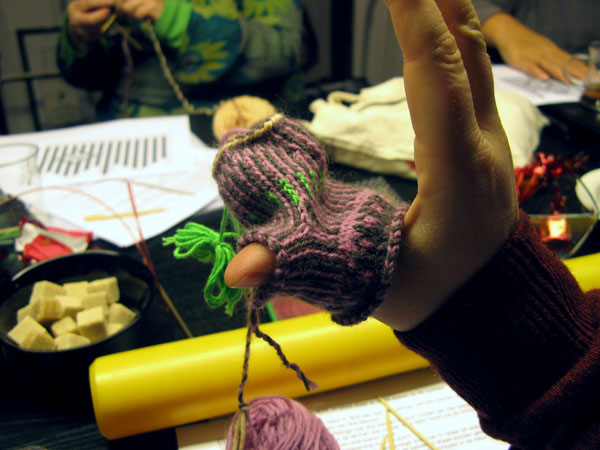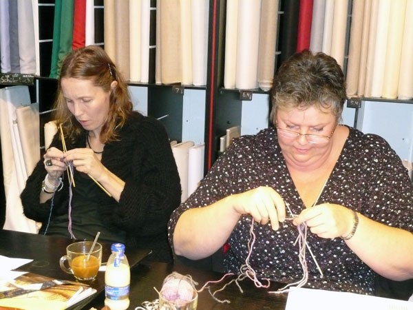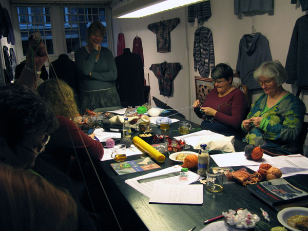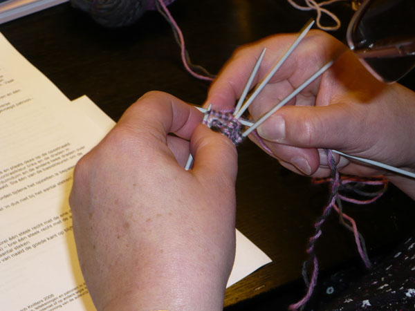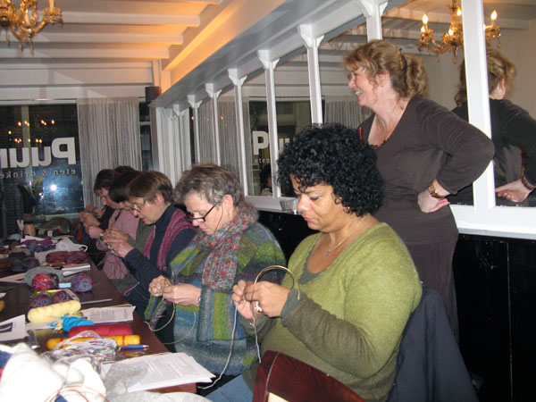 There should be reserved places for knitters in every bus. That was the conclusion we made during Day II of Twined Knitting last Sunday at De Afstap in Amsterdam. The students had more nice ideas, like Knitting for Intellectuals and Zwolse Wanten (Grolse Wanten – Groenlo mittens – knitted during a workshop in Zwolle). After a day hard work for students as well as teachers, we liked the idea of Knitting under Influence better. That will surely happen during the knitting holiday Brei een Ei in the Creuse in France from 11 till 18 April 2009. There we also will combine a program stuffed with knitting knowledge with a lot of fun. And a glass of French wine!