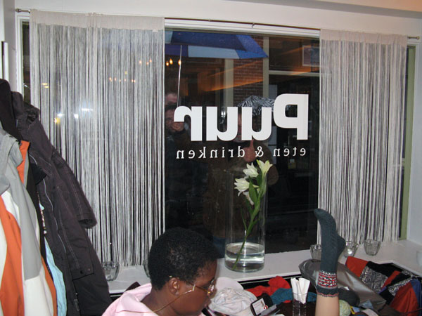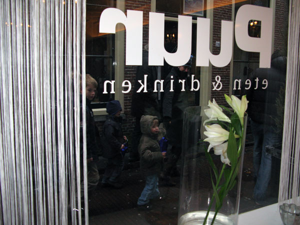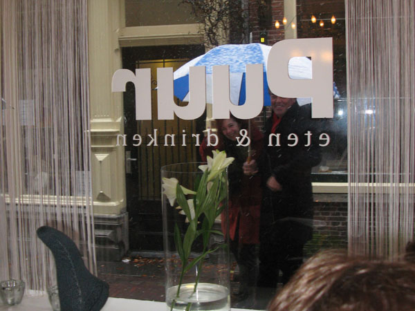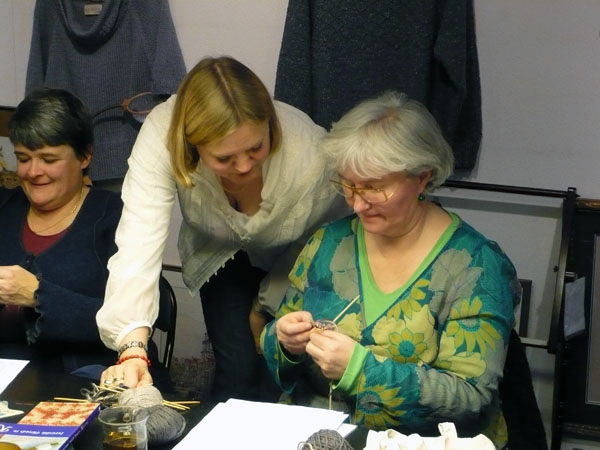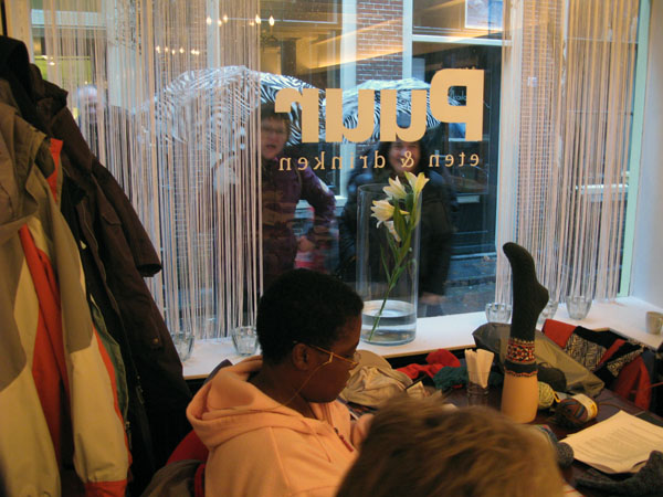 Gisteren was ik voor het eerst bij Ribbels in Leiden voor een workshop Het Naadje van de Kous. Puur, het restaurantje aan de overkant van de steeg waar de in winkel is, bood ons een comfortabele ruimte aan in gepaste sfeer. Die romantische sfeer hing er ook in het steegje en vooral toen het begon te sneeuwen was het net een Anton Pieck-plaatje. De eigenaar van Puur zal wel de ramen opnieuw moeten lappen, want menige voorbijganger maakte een noodstop om met de neus tegen het raam zich te verwonderen over het plaatje dat de groep breiende vrouwen bood. Sokken nog wel!