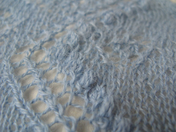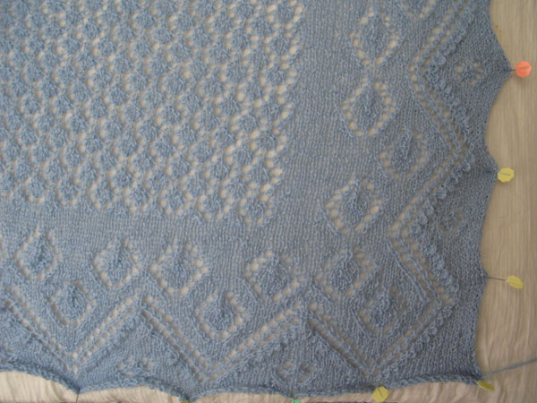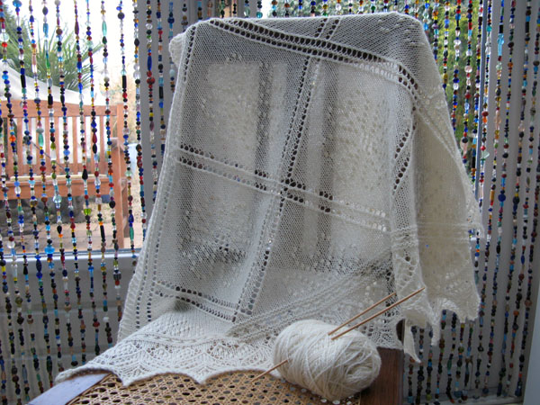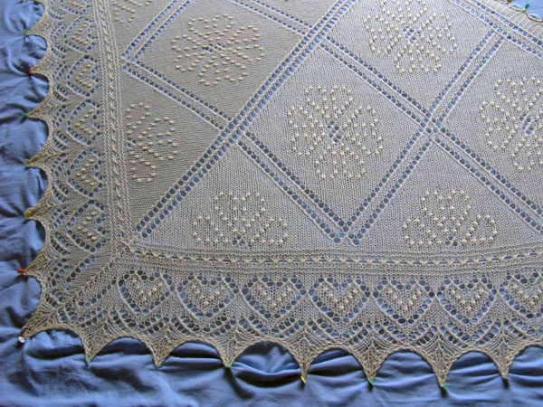 Nog een lichtpuntje in het bestaan van een zieke, zwakke en misselijke breister was de Greta Garbo-shawl van Nancy Bush. Zij was geïnspireerd door het hartmotief en bedacht daar een rand bij. Per abuis was het plaatje van de shawl zonder patroon in het nieuwe boek Knitted Lace of Estonia terecht gekomen. Ons geluk, want het patroon kan wel worden besteld bij Wooly West in een kit met twee strengen Nordic Lites. In vijf dagen tijd breide ik daar verleden week de shawl van die in een iets andere vorm in 1930 werd aangeboden aan Greta Garbo, vandaar de naam. De zesde dag, maandag, blockte ik de shawl op bed, maar ‘s middags werd Greta Garbo zonder pardon het bed uitgezet om plaats te maken voor een koortsige breister.