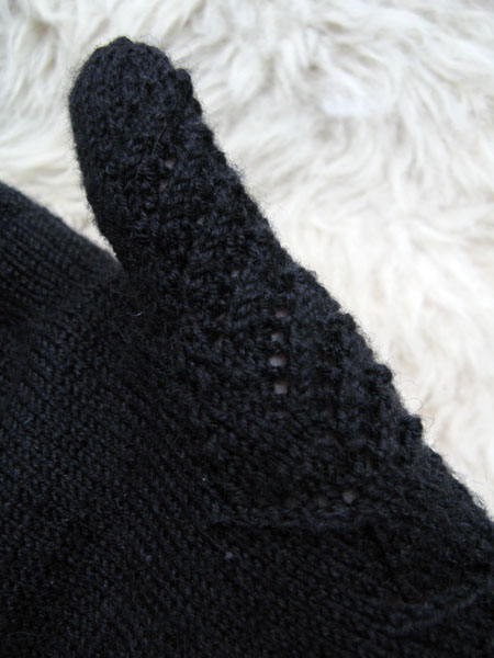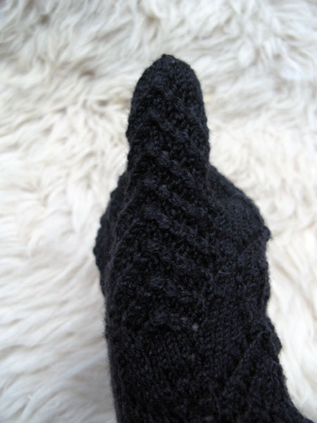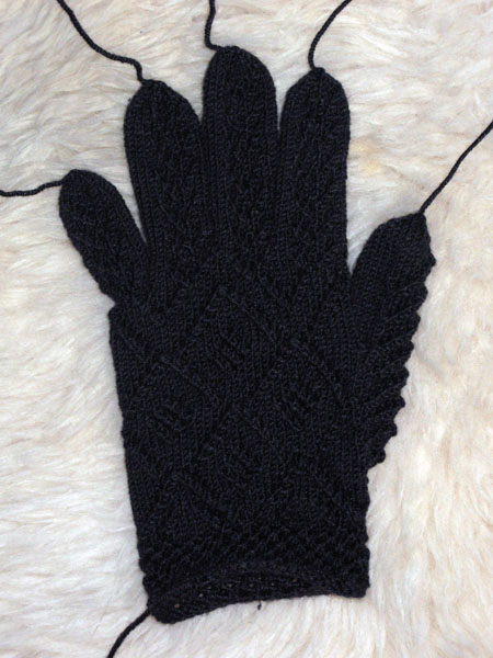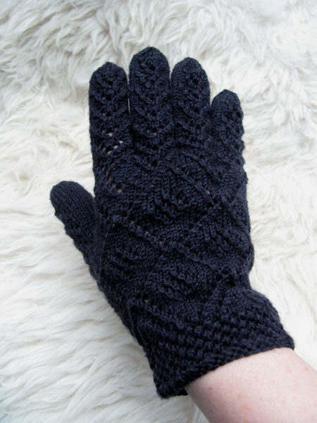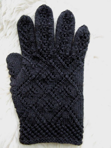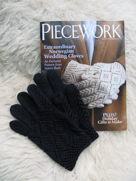 Deze week breide ik de Norwegian Wedding Gloves uit Piecework van Nancy Bush met antraciet garen. Nog ziek, zwak en misselijk van de bronchitis had ik daar alle tijd voor. Barkarole van Austermann is een prachtig garen voor de handschoentjes. Het bestaat uit 70% fijne merinowol, 20% zijde en 10% cashmere. Op bamboe naalden van 2 mm breide het zachte, rondgetwijnde draadje zalig. De duim was me te kort, dus daar heb ik wat herhalingen bij verzonnen. En ik ben er erg tevreden mee. Had ze best aangewild, destijds op de trouwerij, met een handgemaakte hoed. Maar ze zijn ook leuk voor een luxe weekendje Brussel!