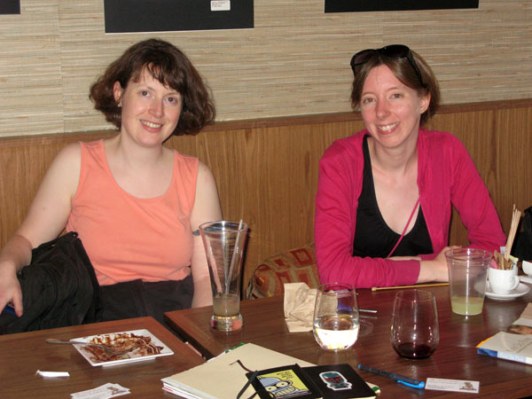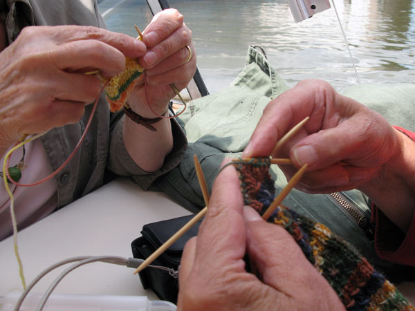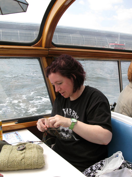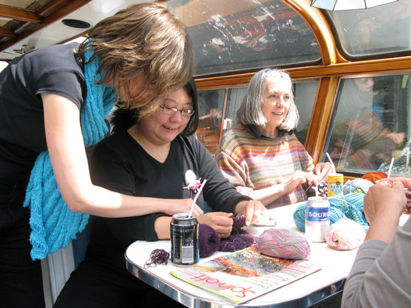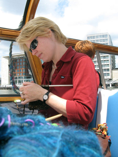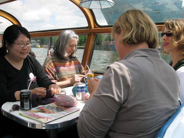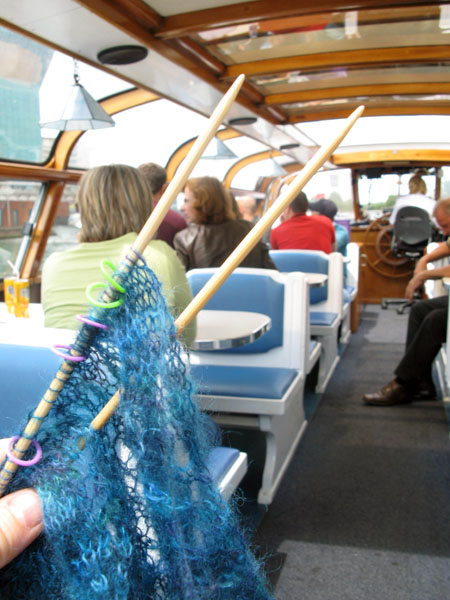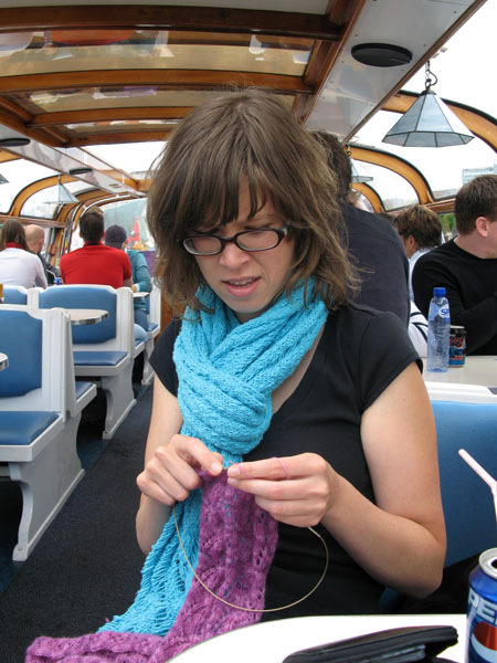 The Point is gewéldig. Eet, brei en wees gelukkig! Een wolwinkel/breicafé pur sang. Gezellig vol met babbelende breiers. Er is een bar waar je van alles kunt bestellen, ook heerlijke koeken en taartjes. Jan voelde zich er wat verloren aan zijn tafeltje met een zwijgende breister, maar ik vermaakte me er kostelijk. Ik vond er geinige doorzichtige breitassen met het logo van The Point en een streng van 1200 yard alpaca in rozenrood. En twee HiyaHiya sokken rondbreinaaldjes van bamboo in 23 cm. Waarom hebben we die hier nog niet?