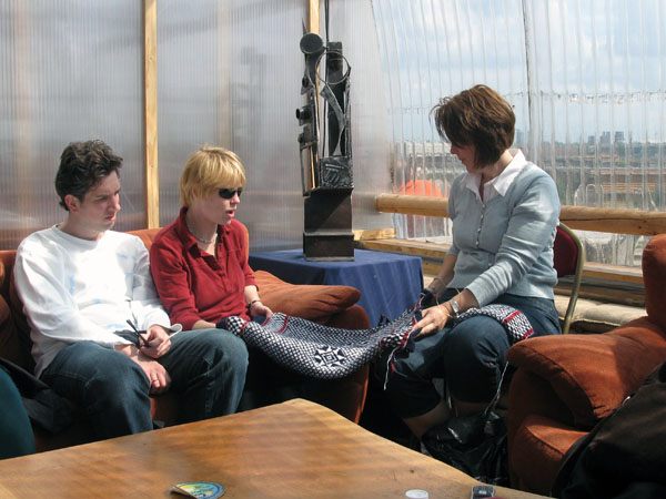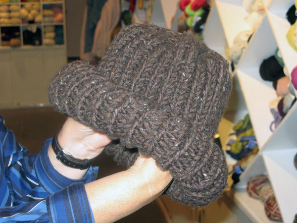 Knitting 321 is gehuisvest in het souterain van een deftig herenhuis. Valerie Kardos, de eigenares, een ex-ontwerpster, zou de week erna ze naar Amsterdam reizen, dus ze zag mijn komst als een geschenk uit de hemel. Nu weet ze tenminste dat ze naar De Afstap moet. Ze vertelde ook dat ze meegewerkt had aan een artikel in Handwerken zonder Grenzen en viel van haar stoel van verbazing toen ik vertelde dat ik voor dit blad schrijf. Ze showde uitgebreid haar ontwerpen. De muts met brede oprolbare rand ga ik zeker ook eens proberen.