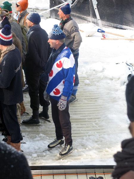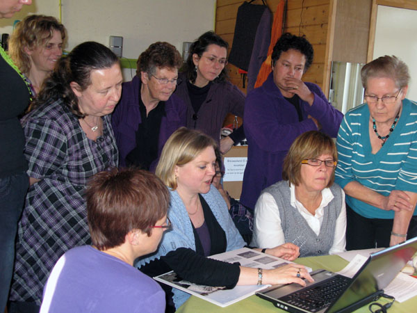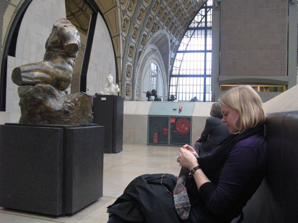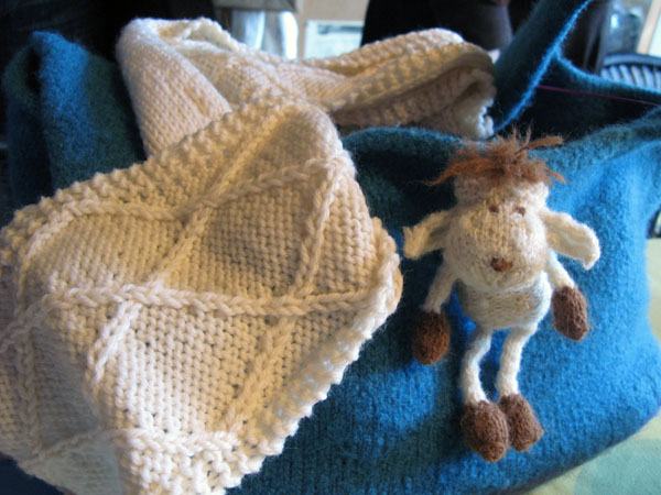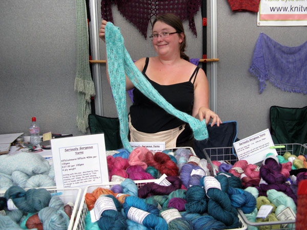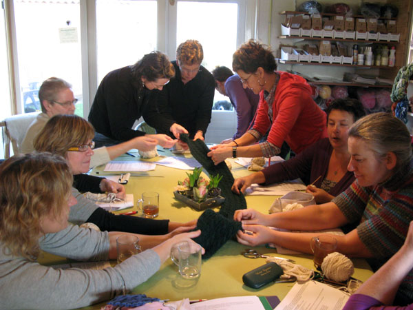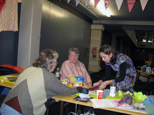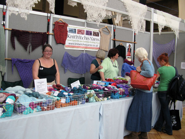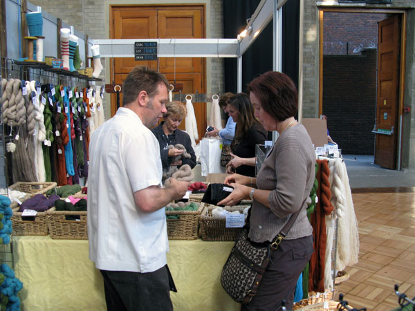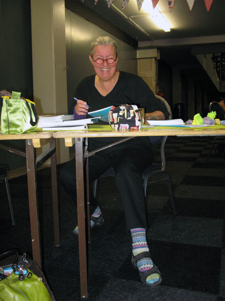 Yvonnep sloot zich met haar sokkentafel onder de onmogelijke titel Dutch Knitters Sock Knitting Café met grasgroene kleedjes gezellig aan bij het breicafé. De schattige babyslofjes uit Piecework, die ze ter plekke onder luid gesteun en gekreun eindelijk in elkaar naaide (breiers zijn geen naaiers), waren eyecatchers, práchtig! Charlotte Hensen, met haar bijzondere gebreide theemutsen had veel belangstelling. Renske Versluis gaf bezoekers een beeld van breien zoals zij dat ziet en produceerde ondertussen met haar enorme punnikgeval een stapeltje grappige sjaaltjes. Anke, Connie en mevrouw Grevers verkochten hun boekje Gelderse Mutsen en gaven workshops. Mede dankzij hun inzet blijft de kennis over dit oud-Hollandse handwerk bestaan.