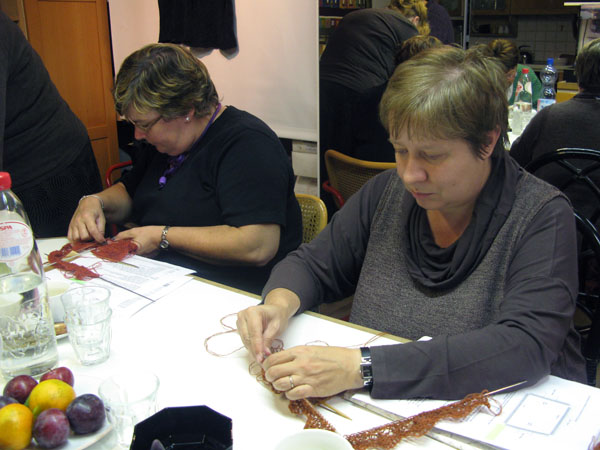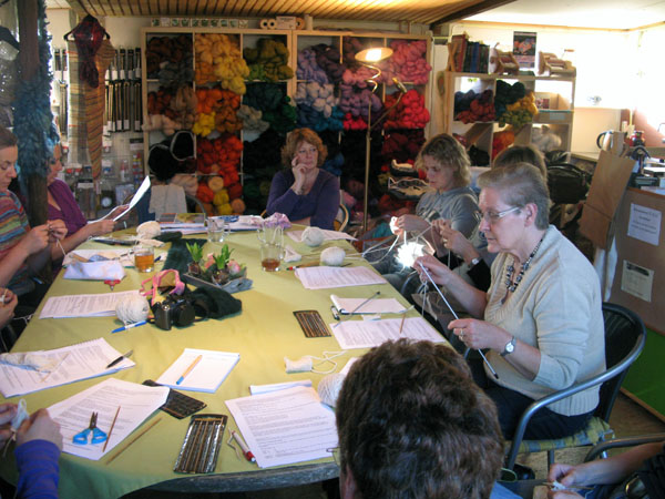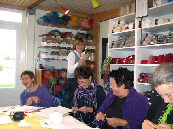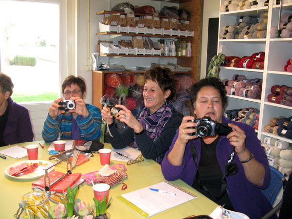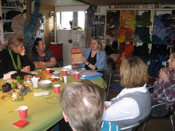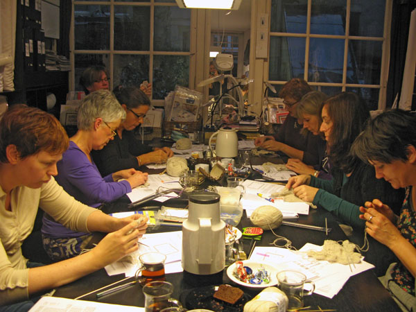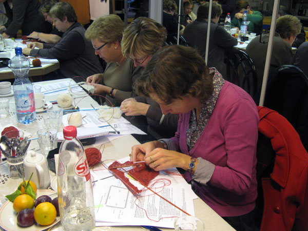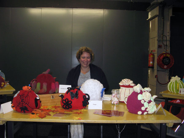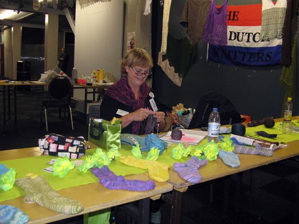 Yvonnep joined us at our knitting café with her sock table with the impossible title Dutch Knitters Sock Knitting Café bringing her green tablecloths. The cute baby socks from Piecework, that she finally sewed together there, groaning and moaning, (knitters are no seamstresses) were real eye catchers, beautiful! Charlotte Hensen, with her remarkable knitted tea cosies had lots of visitors. Renske Versluis gave visitors an image of knitting the way she sees it and in the meantime produced a pile of sweet shawls on her enormous spool knitter. Anke, Connie and Mrs Grevers sold their book Gelderse Mutsen and gave workshops.
