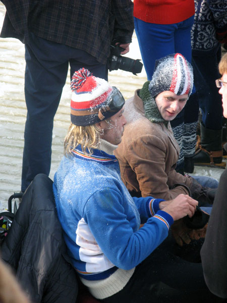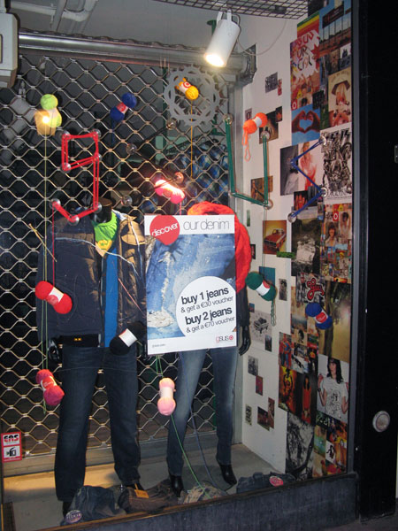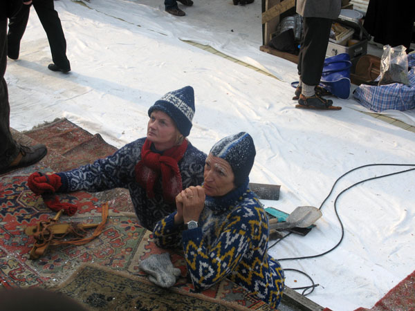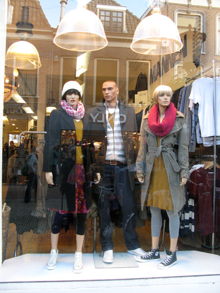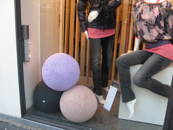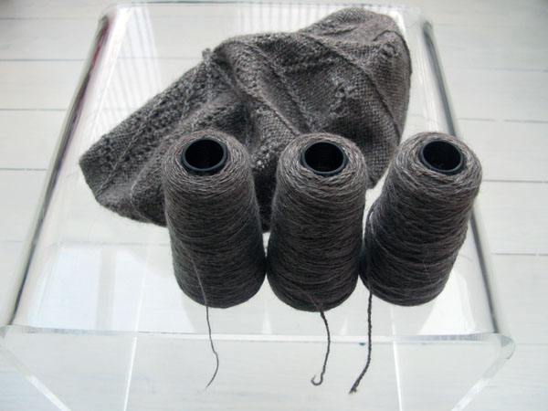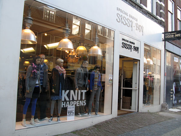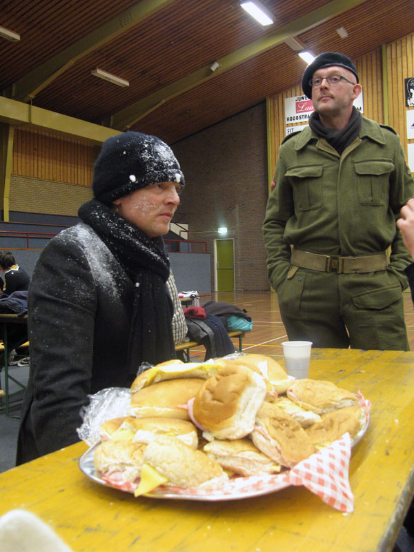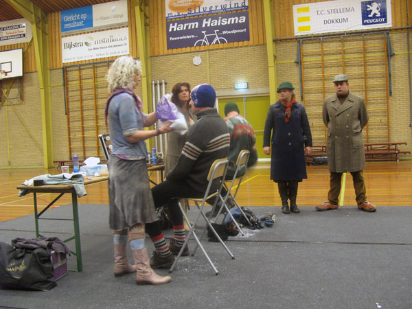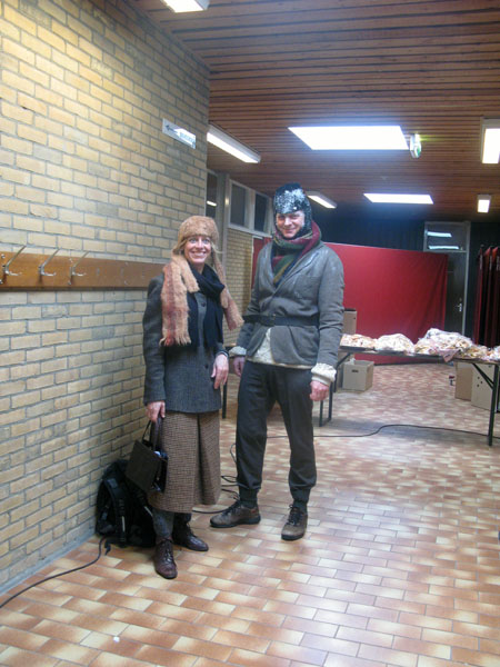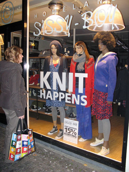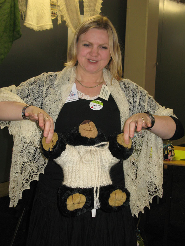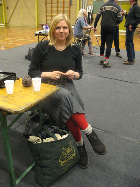 Brent, who leaded the Café on Friday and Saturday (THANKS BRENT!) got a bit tired of all the questions about the Magic Loop and finally stashed my two socks on one circular needle away under the table. Right next to the project with bamboo needles that were renamed Conimex-needles by a passer-by. Corry de B and I knitted along shoulder to shoulder on socks in, coincidentally, the same yarn and Nelleke wore ‘my’ Hanne Falkenberg. Marianne hung her knitted underpants on the washing line again, Australian Fiona pretended never to have lived anywhere else, Brie found herself some yarn with metal for an interesting experiment and Corrie’s Wibi almost choked in a bone, but otherwise had a very nice time at the fair with all the attention from the visitors. Our dear friend from the IKnit fair, Eirwen the Knitwitch, came over from Cardiff, Wales, to join us at the fair for two very cheerful days. It was lovely to have you here Eirwen!
