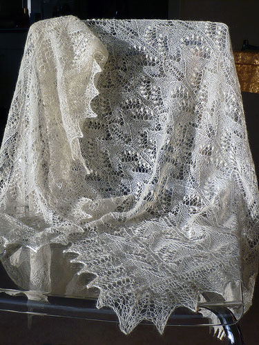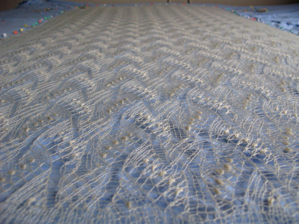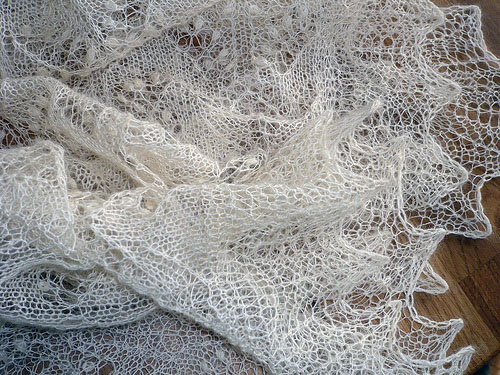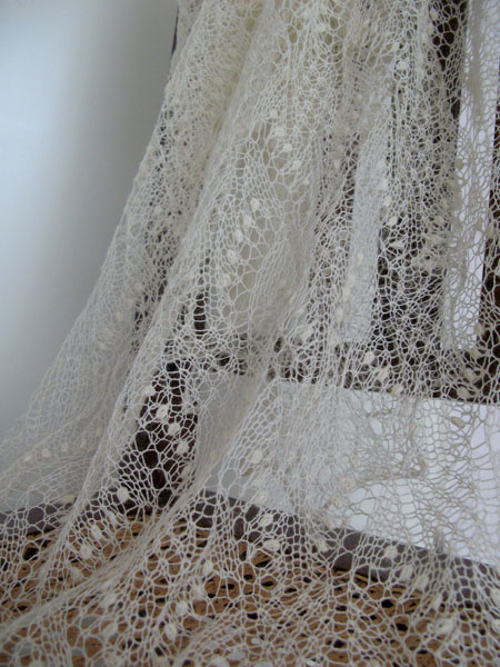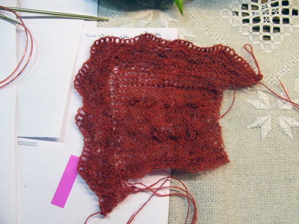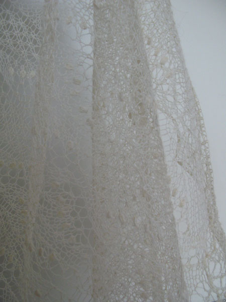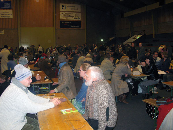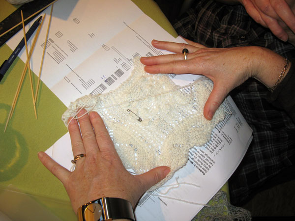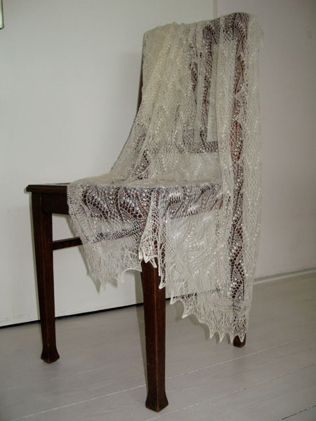The location Ahoy appeared to be perfect for receiving the needle workers who came to the fair in large amounts. It was spacious, light and easy to reach. The Dutch Knitting Café, also Ravelry Meeting Point, had a spacious and not to be overlooked stand and was surrounded by the best yarn stands. The new banners with Antje made it perfectly clear, anyone who loves knitting has come to the right place. That was made clear by the fact that many a knitter settled down on one of the chairs to knit a row or two with us while enjoying a stroopwafel. Jo Ann came to sit with us to sign the new sock book she and Marlies wrote and many a stand holder came to catch his breath at our Café. We got many questions about materials, knitting problems and workshops. And the traditional Estonian shawl that I had finished just before the start of the fair got lots of attention, but also the shawl made with Point Mousse, the no-brainer from hell, was admired. The waiting list for the workshop Estonian Lace in January 2010 has grown a bit longer again. Who wants to join, send a mail to info@thedutchknitters.nl. This also holds good for Het Beter Breiwerk.