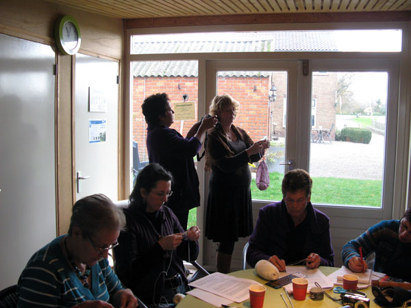 Brent, die op vrijdag en zaterdag de dagelijkse leiding op zich nam (BEDANKT BRENT!) werd de vragen over de Magic Loop we een beetje beu en moffelde uiteindelijk mijn twee sokken op een rondbreinaald weg onder tafel. Vlak naast het werkje met bamboe breinaalden die door een voorbijganger Conimex-naalden werden gedoopt. Corry de B en ik breiden gezusterlijk aan onze sokken van toevallig hetzelfde garen en Nelleke had ‘mijn’ Hanne Falkenberg aan. Marianne hing haar gebreide broekje weer op, de Australische Fiona deed net alsof ze nooit ergens anders gewoond had, Brie vond garen met metaal erin voor een interessant experiment en Corrie’s Wibi stikte bijna in zijn botje, maar vermaakte zich verder prima met alle aandacht van bezoekers. Onze lieve vriendin van de IKnit-beurs, Eirwen de Knitwitch, kwam over uit Cardif Wales om twee gezellige dagen met ons door te brengen. Heerlijk dat je er was Eirwen!