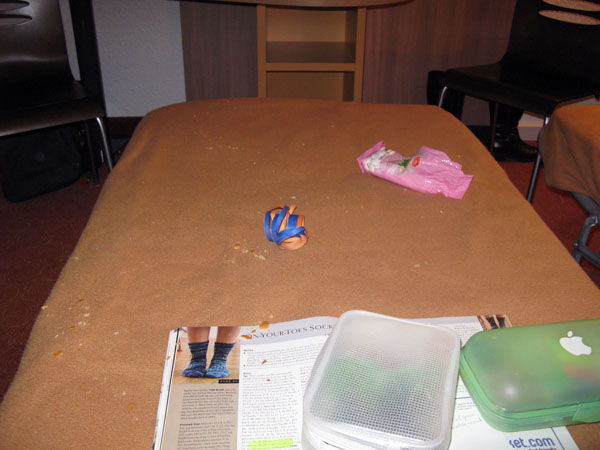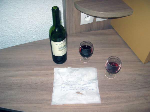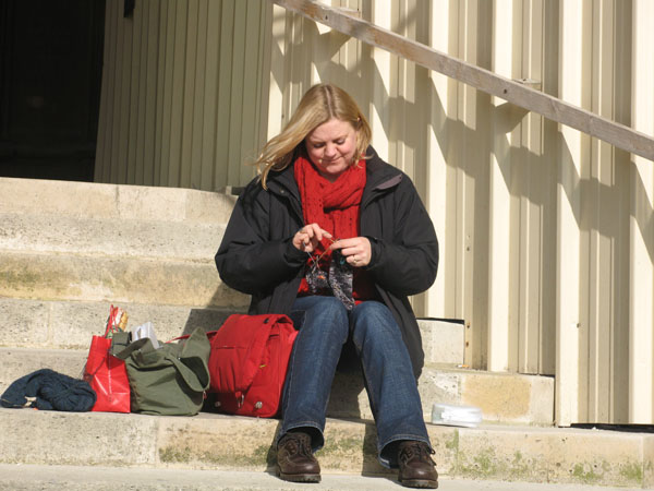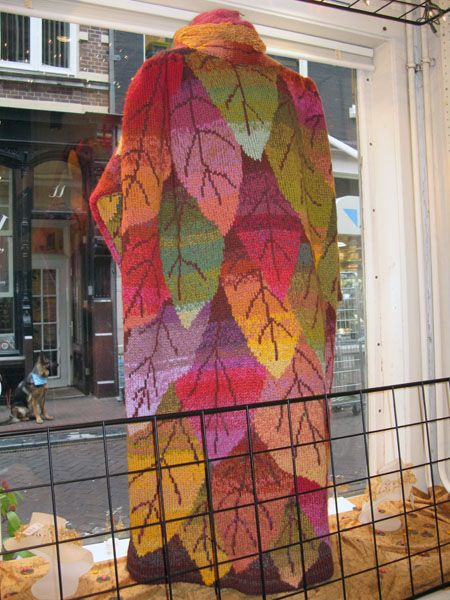 Our trip to Paris wasn’t only ‘knitting and boozing’, like our knitting friend Jan kindly expressed it. In the city we found al lot of knitting related stuff, like a funny poster with knitter in the subway. On the square in front of the Notre Dame it was good to knit with the afternoon sun on our faces and a glass of wine. And at some Starbucks we also did some knitting. During one of these sessions on the Champs Elysées a big man with his sweet girlfriend was sitting beside us. She wanted to take his photo. I passed my knitting to him, two socks on a Magic Loop, and she took the photo. Now she has something to blackmail him with, all his life. Unfortunately we were too late to take a photo too. But we enjoyed the moment. Astonished he remarked: ‘Are these really socks?’.