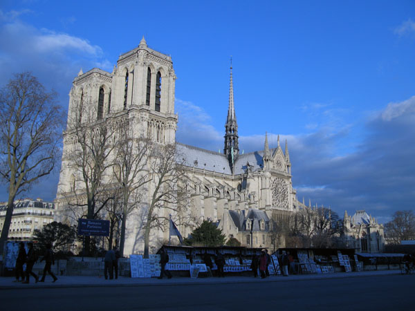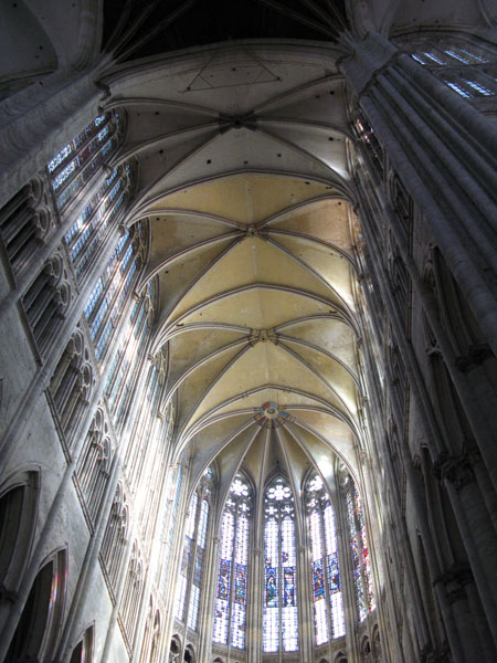 En als je dan om een paar seconden voor acht uur op het Trocadero naar de Eiffeltoren kijkt en opmerkt dat het toch wel erg mooi zou zijn met de millenniumverlichting en hij gaat op dát moment aan, dan heb je het gevoel dat ze ‘m voor speciaal voor jou aanzetten! We sloten de reis af met een bezoek aan Beauvais waar zich de hoogste Gotische kathedraal ter wereld bevindt. Ook hier scheen het zonnetje toen we geduldig op de trappen van de kerk zaten te breien tot de kerkdeur open ging. De rest de tijd hebben we besteed aan het naar binnen werken van een lunch bestaande uit een grand dessert dat we bestelden als gebakje bij de koffie maar dat een complete lunch bleek te zijn. Ach ja, breiend schijn je vijf caloriën per uur meer te gebruiken dus we trimbreien het er wel weer af……