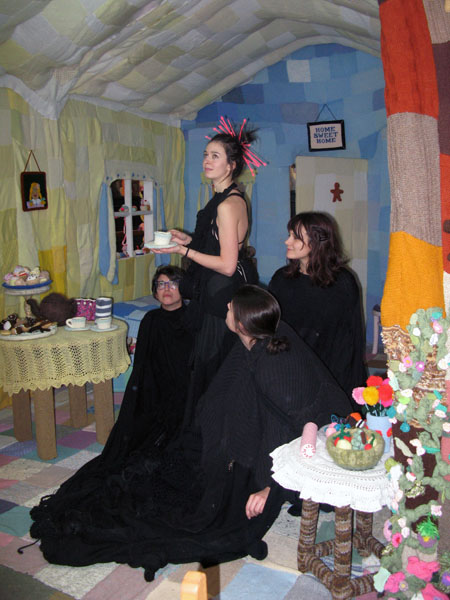 There’s craft and there’s art. And lots in between. In fashion, in my opinion also a form with a large variation in craft and art, knitting is often applied. The French girls of the Parisian fashion academy designed a dress on the spot at L’Auguille en Fête and the wearer as well as three friends found a place to shelter and they proudly paraded around the fair. In the knitted world, a woollen gingerbread house, their stitches disappeared against the background.