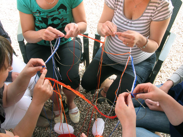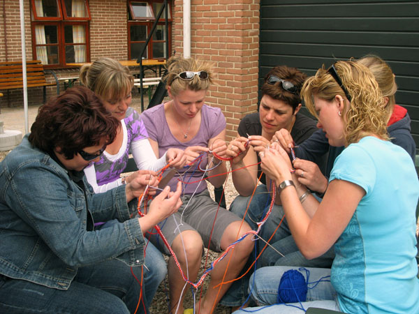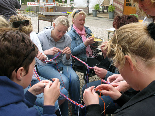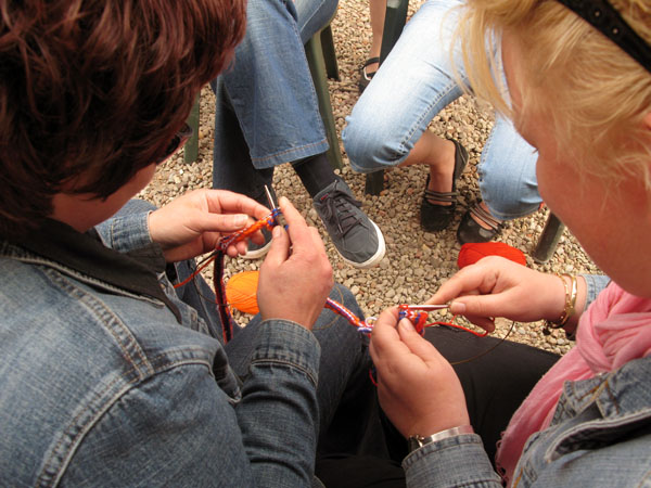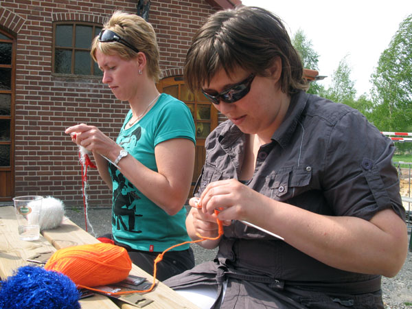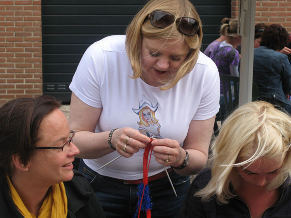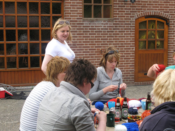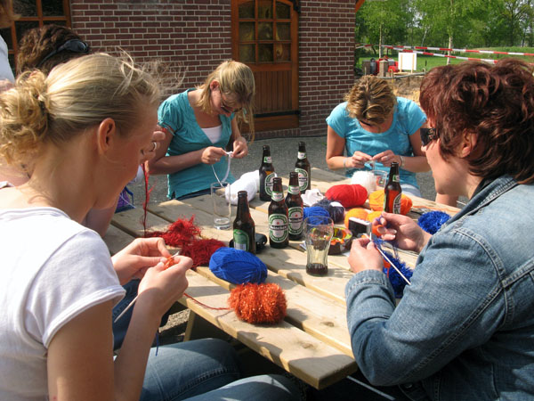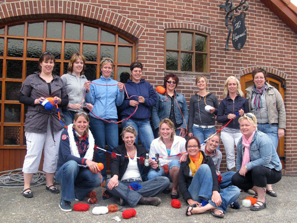 When we get out of the car the smell hits us. Weâre in the countryside. On a camping site near Nijkerk 16 Frisian girls in ages varying from 25 till 35 celebrate the second lustrum of their annual girlsâ weekend. They sit in the sun waiting for us with their bottles of beer within their reach, still unaware of whatâs ahead of them. âThis is going to be funâ, Hil and I think, with somewhat mixed feelings, when we approach them with our The Dutch Knitters-t-shirts. Most of the girls are of our calibre as far as the spicy remarks were concerned, so in fact we could have used plan A (knitting strings and willy warmers), but plan B, knitting garlands in two different ways went down well too. We appeared to have been chosen on the basis of our logo with the knitting pin-up, making it clear from the start that the girls mainly wanted a fun activity. So now knitting entertainment has been added to our curriculum vitae. You can hire us for parties and events.