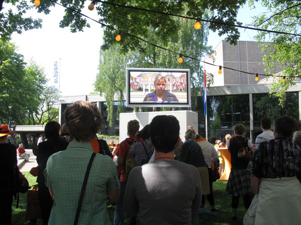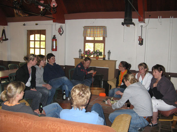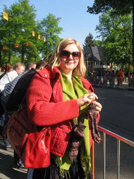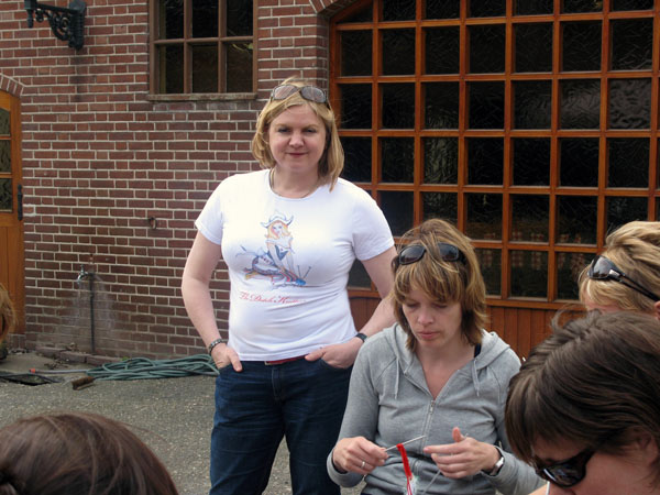 The real Frisian cake was delicious. A few die-hards knitted on during the break. In the meantime I told them about knitted wombs, organ knitting and other filthy nonsense from the current knitting world. By the time it was five oâclock they had knitted 3.5 meters of I-cord and nearly 3 meters of garland knitted in the round. A group photo was taken in front of the stable doors with a fake horse after which the girls went to a restaurant to have diner and we went home, enjoying the memory of this merry afternoon. It was a wonderful change for the very serious workshop Estonian Knitting Techniques we gave the next day at Ribbels in Leiden. Very nice too and for sure less tiringâŠ..