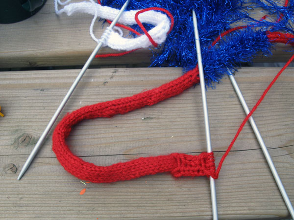 They knitted on courageously on the I-cords in red-white-blue-orange squeaky acrylic yarns and later on in the most hilarious yarns we could find them. These can easily be used as Christmas decorations as well. The Surprise knitting-in-the-round, in which an enormous tubular piece of knitting (read garland) is created on eight circular needles, turned out to be a challenge for most of them, but it worked as long as they did exactly as they were told. This ultimate team building-project, which forced them to work very close to each other, was a challenge for new knitters but despite the drama, knitting cramps and complaints about fallen stitches they succeeded very well. Some of them truly do have a talent for knitting, some had less, but we wonât tell which of them. One knitter only wanted to appear on Life ân Knitting unrecognisably, but we refuse to do that. Nobody should be ashamed for knitting activities!