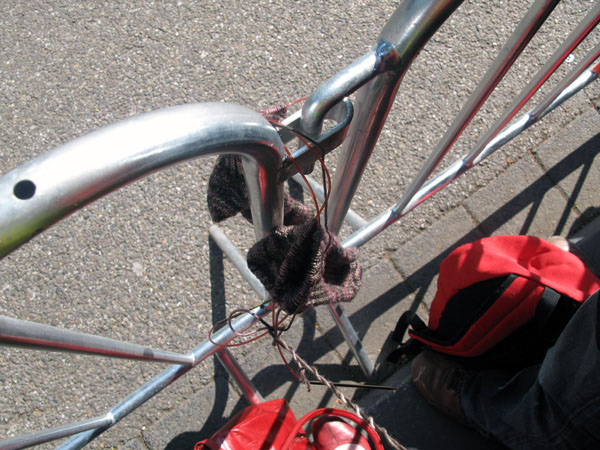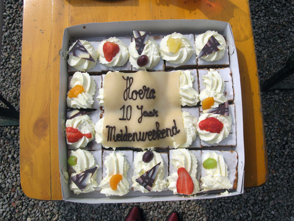 De echt Friese taart smaakte zalig. Een enkele die-hard breide door tijdens de pauze. Ondertussen vertelde ik over gebreide baarmoeders, orgaanbreien en andere gore onzin uit de huidige breiwereld. Tegen vijf uur lag er 3,5 meter feestelijk I-cord en bijna 3 meter rondgebreide slinger. Er werd nog even een groepsfoto gemaakt voor de staldeur met neppaard waarna de meiden richting restaurant en wij huiswaarts gingen, nagenietend van een vrolijke middag die een heerlijke afwisseling vormde met de bloedje serieuze workshop Estlandse Breitechnieken die we een dag later in Leiden bij Ribbels gaven. Ook leuk overigens en beslist vermoeiendâŠâŠ
