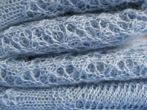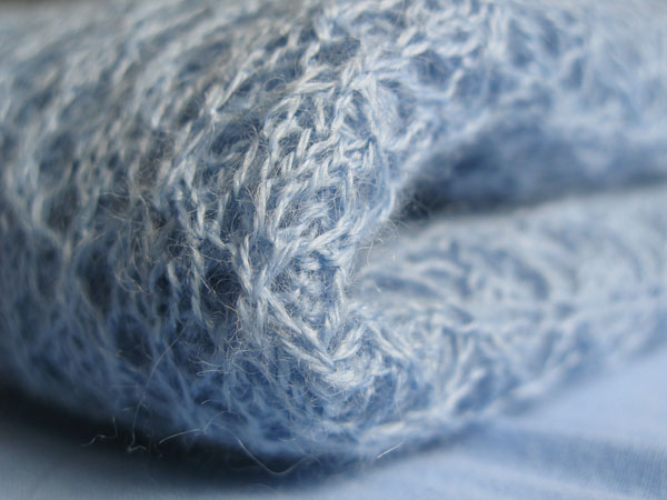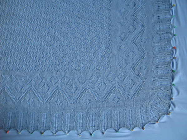 Eindelijk is hij af. De lichtblauwe Estlandse alpaca shawl op naalden 2,25 mm. Een zucht van verlichting toen de laatste steek van de naald rolde en een kreetje van blijdschap toen ik zag dat hij precies zo is geworden als dat ik ‘m wilde. Het was even doorbreien, maar dan heb je ook wat.