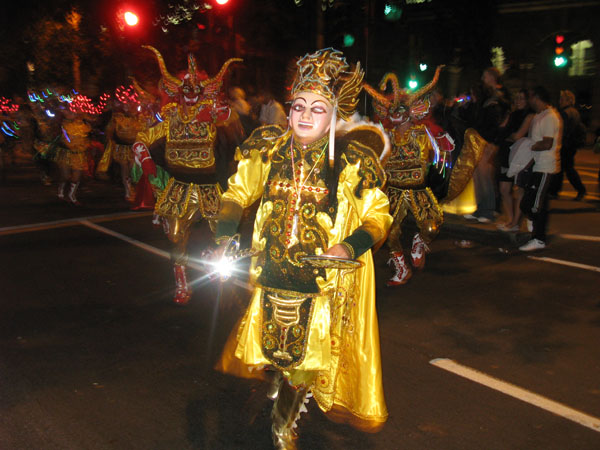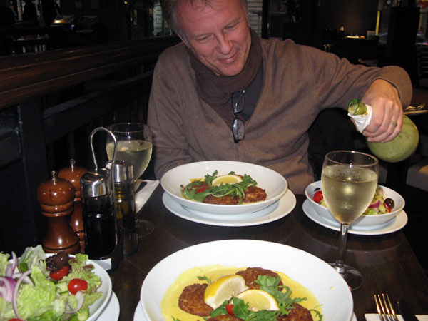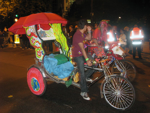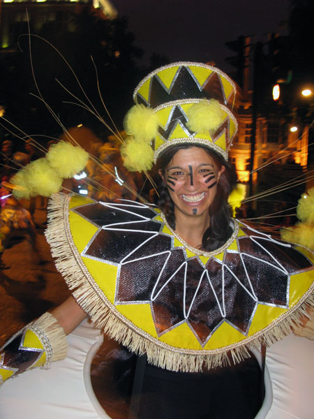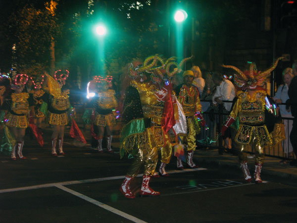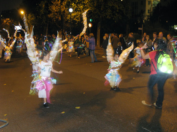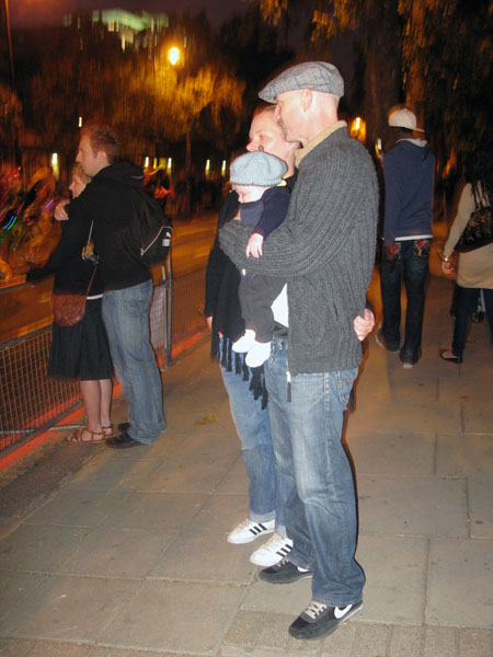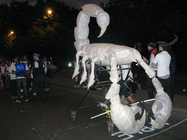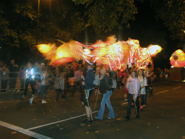 After having visited Buckingham Palace and having had tea with traditional cake in the Queen’s garden, we had dinner at Prezzo, our favourite Italian restaurant in Trafalgar Square. Delicious, crab cakes in a saffron sauce. On the way to the underground we did strike it lucky, it was the night of the Thames Festival,, where people dressed as water creatures exorcized evil spirits from the Thames with lots of drumming and many small lights.