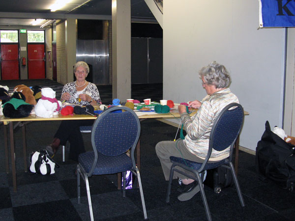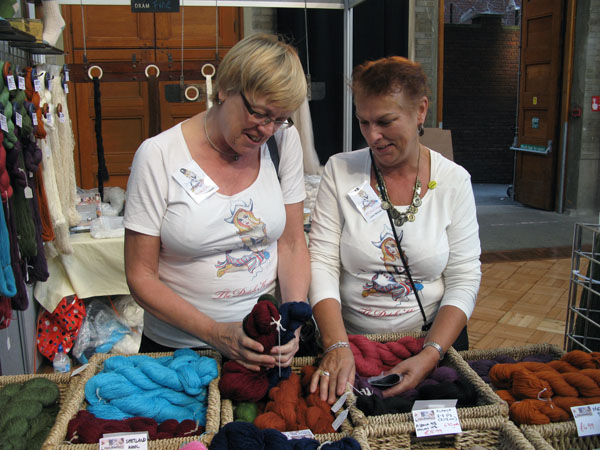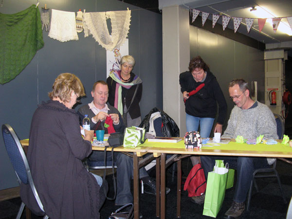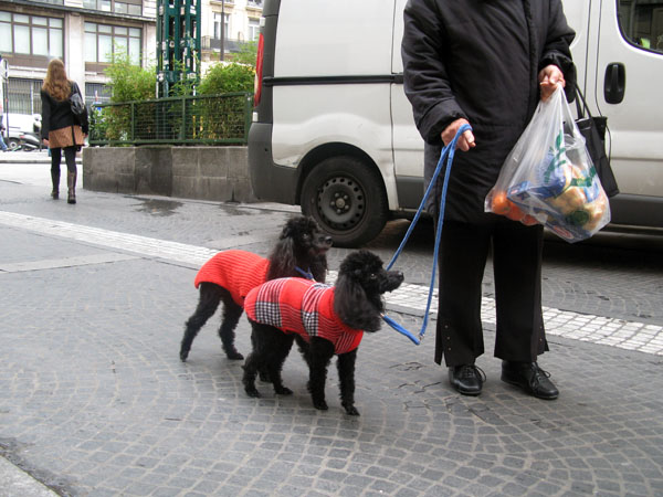 We were not looking for knitting, but on every corner of the street we were confronted with the phenomonon of knitting. Shop windows were stuffed with knitwear and often the requisites used were knitting related too. On many French heads there were knitted bonnets. And in Arts et Metiers we saw two lovely poodles, a mother (23 years old!) and her daughter. They kept their backs warm with dog coats, the mother was wearing a red knitting coats. And on many terraces (yes, most of the time we had good weather) I knitted a few rows on my socks.