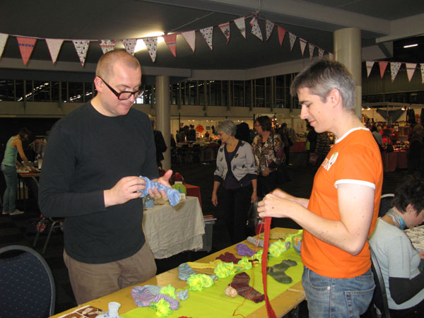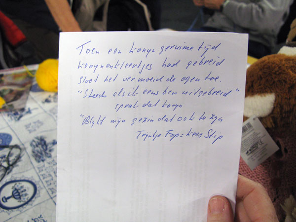 Japans is blijkbaar hot in Parijs, want bij Uniqlo, een nieuwe trendy Japanse kledingzaak, was het superdruk. Vooral de HeatTech shirts zijn in, dus ik kocht er ook maar eentje, een felgroene voor onder mijn wikkelvestjes. Bij Junkudo, de Japanse boekhandel, kocht ik een prachtig sokkenboekje met duidelijk teltekeningen van hielen en tenen. Helaas is Brentano, de boekhandel met breiboeken en een Stitch ‘n Bitch op zaterdagmorgen, failliet. Daar is men definitief uitgebreid…..