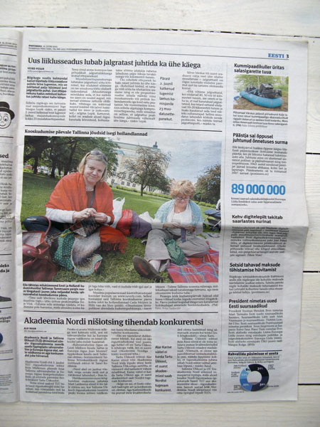 De laatste tijd was het weer flink raak, ook in de kranten. Tijdens de Handwerkbeurs in Rotterdam besteedde het AD maar liefst twee volle pagina’s aan de breitrend. Afgelopen vrijdag stond de Afstap uitgebreid in de Metro in het kader van het koude weer. Ik stond toevallig achter de toonbank en introduceerde daar spontaan een nieuwe term: ‘breierig’. Maar het grappigst vond ik het artikel in de Postimees, een Estlandse krant, die ik verleden week toegestuurd kreeg door Monika vanuit Tallinn. In juni breiden we mee met de WWKIP Day in een park in Tallinn. Een joekel van een foto plus een voor ons onleesbaar artikel verscheen pontifikaal op pagina 3. En nu maar hopen dat ik niets geks heb gezegd! 😉