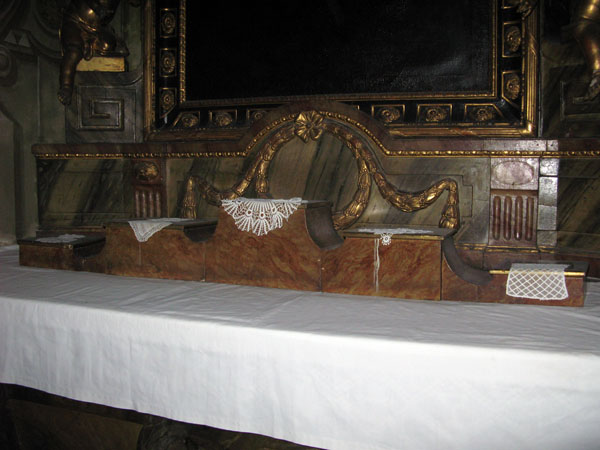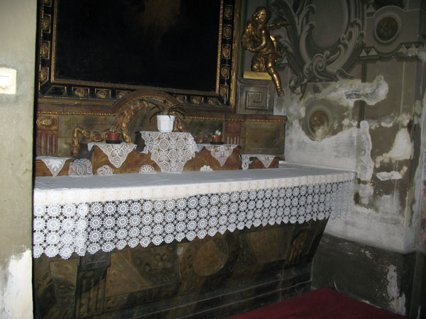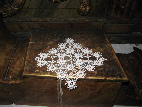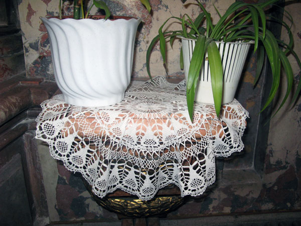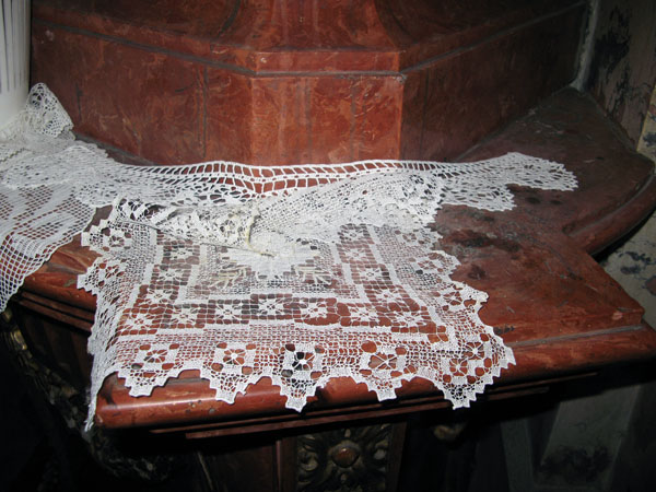 In beautiful Boedapest in Hungary where Jan and I spend some time this autumn, I found a church where on every altar some lacy doilies were placed. Some were a bit damaged, but all were clean or even blocked or starched. Often a cosy flower pot with a sickly plant was placed on it. Only one was knitted, the rest was tatted, bobbin lace or crocheted. Despite the holes they obviously think it worth while to keep the damaged doilies. The mouse-still and deserted church itself could use some maintenance too, but the badly maintained interieur in combination with the snow-white doilies that were everywhere, made the walk through the church there into a mysterieus experience with a domestic touch.