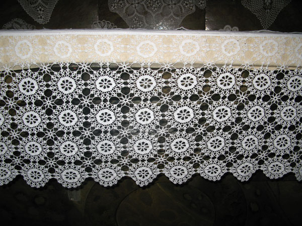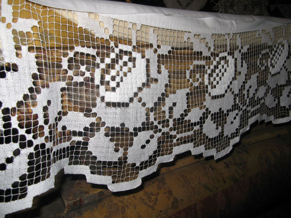 In het prachtige Boedapest in Hongarije waar Jan en ik afgelopen najaar waren, vond ik een kerk waar op ieder altaar minstens één kanten kleedje lag. Soms waren ze wat gehavend, maar wel schoon en de meeste zelfs geblocked of gesteven. Vaak stond er een gezellige bloempot met een kwijnend plantje op. Slechts één ervan was gebreid, de rest was frivolité, geklost of gehaakt. Ondanks de gaten vind men het blijkbaar de moeite waard om de gehavende kleedjes te laten liggen. De doodstille verlaten kerk zelf was ook toe aan wat onderhoud, maar het vervallen interieur in combinatie met het hagelwitte handwerk dat je overal zag, maakte de ervaring om er rond te lopen tot een mysterieuze ervaring met een huiselijk tintje.