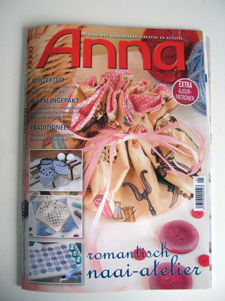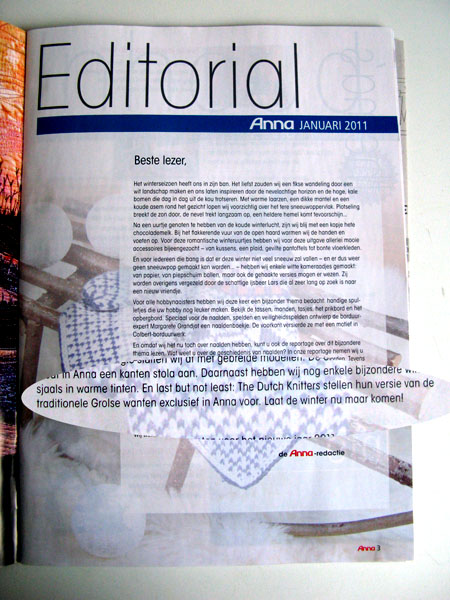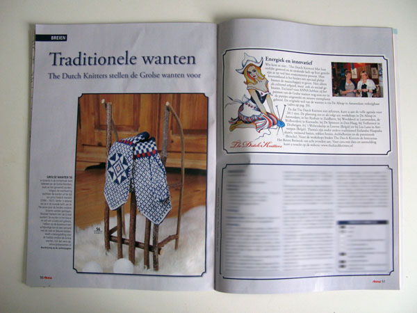 This pattern is now featured in the Anna (publisher Burda), the well-known crafts magazine that is for sale at nearly every Bruna or other good stationer’s. The yarn is of course a 100% woollen yarn by Rowan, available at the Afstap in Amsterdam. You only need a few balls, so come on, grab those needles and start knitting! Soon you will be walking through the snow with real Grolse Wanten. For the winter will continue for some time it seems….