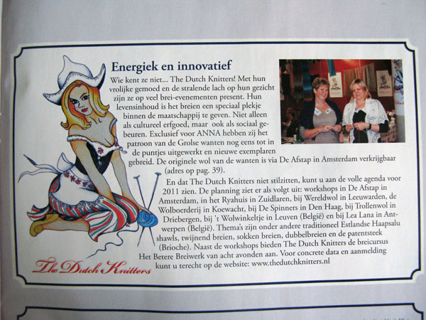 Lately this was the case, also in the written media. During the Handwerkbeurs in Rotterdam the AD (one of the most important papers in the Netherlands) filled two full pages to the knitting trend. Last Friday, when it snowed, the Afstap was the subject of an article in Metro (a free newspaper distributed in the public transportation). I happen to be behind the counter and introduced spontaneously a brandnew expression: ‘breierig’ (eager to knit…..). But the funniest was the artikel in Postimees, an Estonian newspaper, that Monika from Tallinn has send to me last week. In June we knitted along for WWKIP Day in a park in Tallinn. A huge photo of plus a artikel we can’t read appeared pontifical on page 3. Let’s hope I didn’t say anything silly! 😉