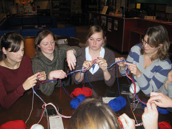The fact that not everyone had the same speed, could knit with the same tension and was prepared to give their needles to the person next to them, appeared during the circular knitting for ten knitters. Nevertheless they managed to cast on a gigantic piece of knitting, something that can be considered a successful experiment, in the social sense as well as in the field of knitting.