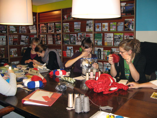‘Ik leer je breien niet zoals je oma’, dat is wat er in de folder van Parnassos stond als beschrijving van mijn breicursus voor studenten. En dat bleek ook wel. Want ondanks dat het merendeel om absolute beginners ging, liet ik ze alle hoeken van de kamer zien als het om breien gaat. Vanaf de tweede les breiden ze I-cords, kabels, gespiegelde minderingen en meerderingen, rondbreien op rondbreinaalden én rechte naalden, liet ik ze qiviut knuffelen enz. Want wie zonder voorkennis naar een techniek kijkt, zit niet vast aan allerlei ideeën over hoe het moet en kan los gaan met experimenteren en tot geweldige dingen komen.