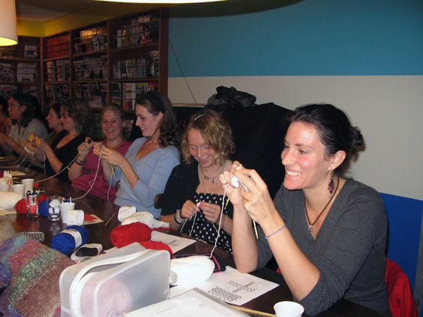 Voor mij was het ook een zeer geslaagd experiment om eens aan beginners in plaats van aan (ver)gevorderde breiers les te geven. Want dat bleek best lastig. Ik had bijvoorbeeld niet bedacht dat een beginnend breier niet weet welke kant ze op moet breien en hoe ze de draad op spanning houdt. Dus uiteindelijk kwam ik met de allermeeste leerpuntjes (breipuntjes?) uit de strijd. En hierbij wens ik de twintig ijverige breistudentes nogmaals veel succes en breiplezier!