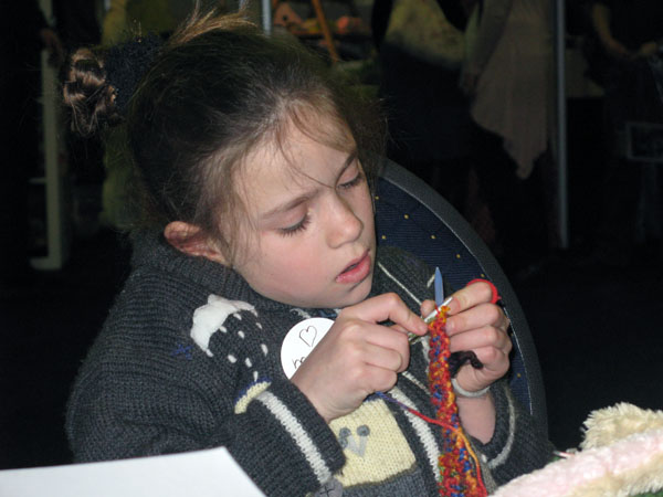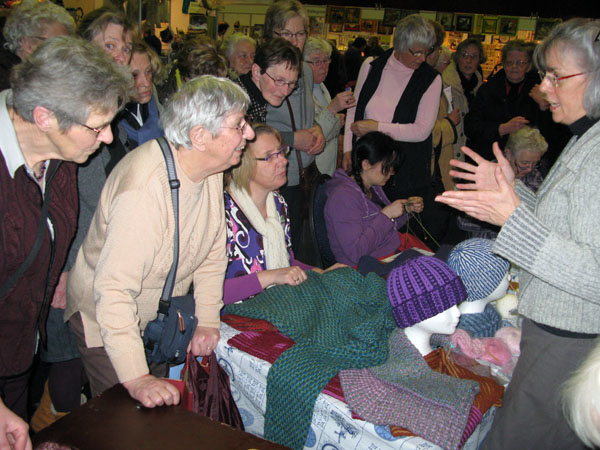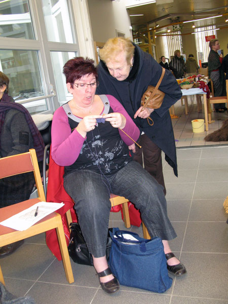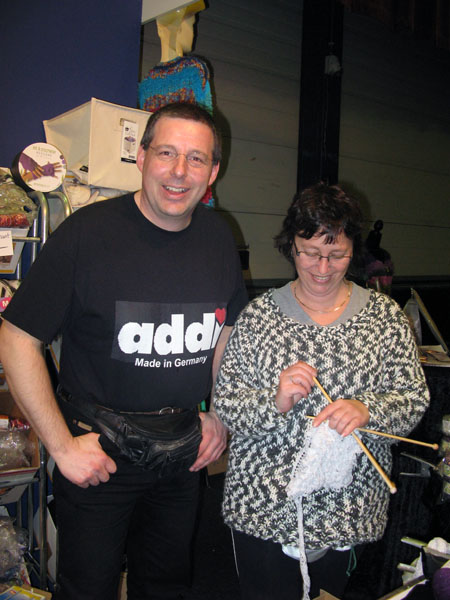 The circular needle is still a strange object for many elderly knitters. I compared the principle of the circular needle with a pan, but became tired of the extensive explanation and finally could utter no more than ‘a circular needle is like a pan’ which they of course did not understand. Brent came up with a more visual method and with much less words he demonstrated flat and circular knitting. Many a lady got inspired so we voluntary knitting promoters do a good job at these fairs, don’t you think?