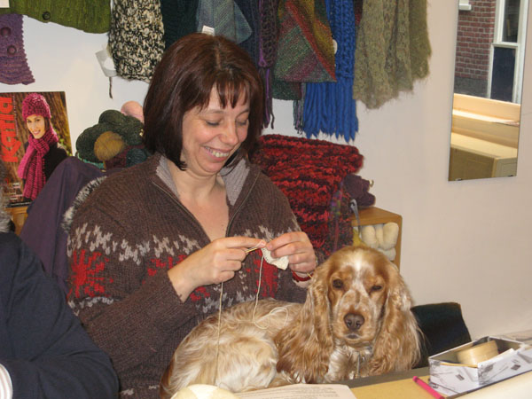 Alle cursisten genoten van een lekker dagje breien, nieuwe dingen leren en smullen van de lekkernijen en broodjes van Christa. Het venijn zit ‘m bij Estlands Kant Traditioneel in de staart en en dan bedoelen we niet die van Floortje, het schattige Spanieltje van Annelies. Floortje vond het namelijk allemaal wel best, want ze was allang blij dat ze mee mocht met haar vrouwtje bij wie ze rustig op schoot zat, zachtjes schuddelend door de ritmische beweging van haar naalden. Annelies breide haar hele minishawltje om haar heen. Het was Floortjes taak ons te beschermen tegen de vele nieuwsgierigen die terwijl ze door het zonovergoten steegje liepen een noodstop maakten om het breitafereel gade te slaan door het raam van de winkel.