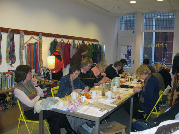 Would they come? Had all mails been received? Ah yes, they came but they were far younger than we had expected. There were eleven, merely 20-year old genuine students, all of them with some knitting in their bags. Anyone who claims that knitting is only for elderly ladies, may wash his mouth with soap. Most of them were absolute beginners, but full of enthusiasm and knitting plans for the future. Nancy took her chance to clear out some of the stash from her attic and even made one of the knitters happy with her book Knitting Brioche. Cassandra and I also won prices, but thinking of my own attic with a lifetime exceeding stash, we decided to enter both prices into the lottery again, after which an even happier winner was found among the students.
