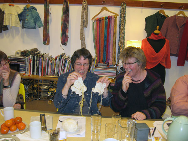 Hoewel het breien en afwerken van een traditionele Estlandse shawl best lastig is, werkten alle cursisten zich zonder al te veel problemen door het minishawltje heen. Adrie verraste ons met opmerkingen doorspekt met droge humor en Manuela en Jit lagen in een deuk toen ze onderling hun shawltjes vergeleken en zagen hoe verschillend van grootte ze waren. “Maar ik ben veel groter dan jij hoor”, zei Jit en ze rolde onder de tafel van het lachen.