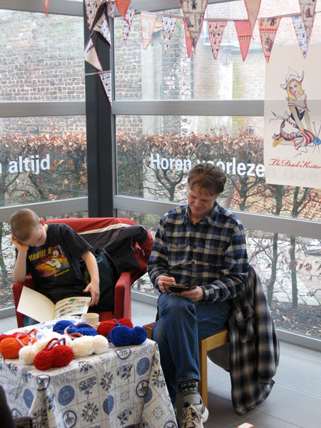 Begin februari waren we weer in België, in Eeklo, een stadje waarvan ik voorheen nog nooit had gehoord. Maar in de bibliotheek werd door Martine Vermeire Bezig Beestig georganiseerd en dat maakte de reis meer dan waard. In de veranda, een mooie lichte ruimte achter de bibiliotheek, waar normaal gesproken de oudere heren uit de stad de ochtendkrant lezen, richtten we samen met onze Belgische breivriendin Yarnlot (Marie-Paule) een gezellig Dutch Knitting Café in. De serieuze spinner, die ook zijn intrek nam in de veranda, trok zich niets aan van het gebrei en gebep en spon vlijtig door, zelfs toen rond het middaguur Janny met de harde kern uit de Koewachtse breiwereld binnen kwam. Janny dook in de door Christine van Stoffenidee meegebrachte Rowan-boeken, want binnenkort gaat ze haar wolwinkeltje in Koewacht verrijken met deze prachtige garens en patronenboeken.