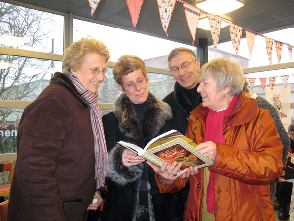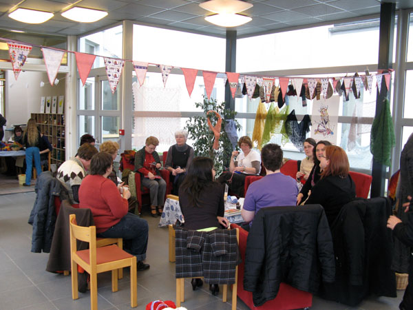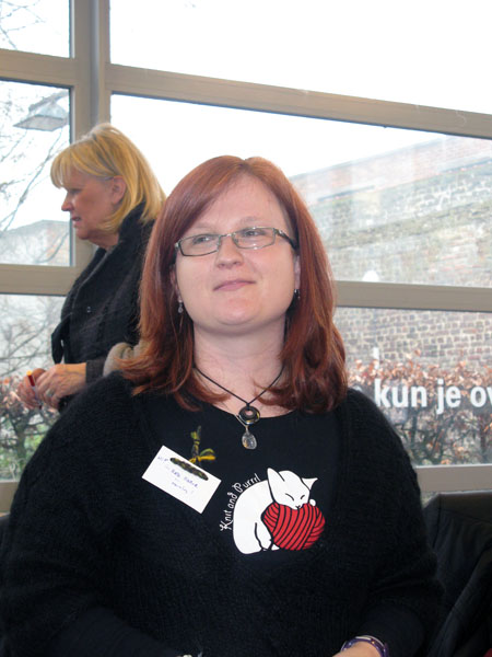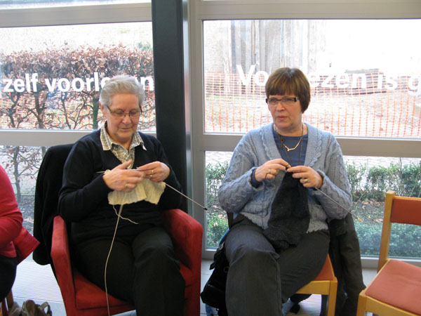 At the beginning of February we were again in Belgium, in Eeklo, a small town I had never heard of before. But in the libraryBezig Beestig was organised by Martine Vermeire and that made the trip more than worthwhile. In the conservatory, a nice light space situated at the back of the library, where normally the elderly men from the town read their morning papers, we set up a nice Dutch Knitting Café together with our Belgian knitting friend Yarnlot (Marie-Paule) The serious spinner, who took his place in the conservatory as well, did not get distracted by all the knitting and chatting and spun diligently, even when Janny and the hard core of the Koewacht knitting scene came in. Janny huddled over the Rowan books brought by Christine of Stoffenidee for she will soon be enriching her yarn shop in Koewacht with these lovely yarns and pattern books.