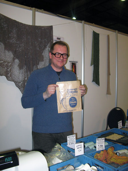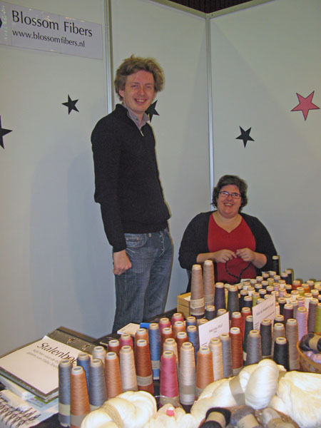 The exhibitors that were grouped around the knitting café gratefully made use of the knowledge of the Dutch Knitting Café knitters and gave us new materials to test. Some of the newcomers had already expanded and are a wonderful addition to the reputable exhibitors. Wolhalla, het Ryahuis, Storm op Zolder, Mur, Zeven Katten, Trikoo, Blossom Fibers, Wolmarkt, Wereldwol, De Spinners, Hoooked, Wolhemel, Van Moosdijk, Breiwinkel, Naald en Draad en Astrid’s Dutch Obsessions, and I undoubtedly forgot to mention one or two, they were all more than willing to serve us with desirable yarns, books and knitting tools! Bart en Francis, aka The Belgian Boys, were present again with their special yarns and fantastic bargains. And the Chiquita bags were well chosen according to Francis because they could also use them on vegetable fairs as well as erotic fairs….. I do not take the cheerful boys completely serious, but their beautiful yarns for very low prices all the more.