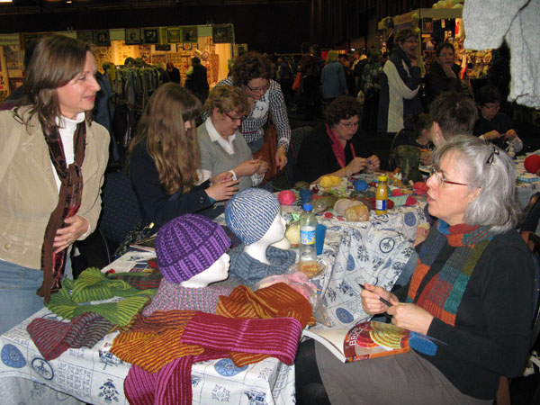 Nancy Marchant arrived on Saturday with her big black suitcase filled with knitting and proudly signed her book Knitting Brioche while I explained the basic principle of the brioche stitch with my Geveldak scarf. The scarf, that seems to knit itself because the colours give you such a happy feeling, grew steadily during the fair and in three days I’m half way. Naald en Draad sold their entire stock of Knitting Brioche and has to order new copies immediately. On Nancy’s request we will be giving classes on the many colourful possibilities of the brioche stitch next fall. Yep, we’re very honoured!