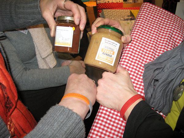 Corry had weer haar Kika-beren en dit jaar ook zalige potjes handgemaakte jam mee voor Steppen tegen Kanker. De ingezamelde glazen potjes waren volgens Hil wel aan een gezellig jasje toe en dus gingen we op zoek naar roodbonte katoen. De medewerkster van Jansus & Jansus draagt het doel een goed hart toe, zoals bleek aan het armbandje dat ze liet zien. Ze doneerde een flinke lap voor het goeie doel. Dank je wel Jansus & Jansus! Corry haalde met beren, jam, berenkleding en donaties maar liefst 239 euro op! Goed gedaan lieve meid!