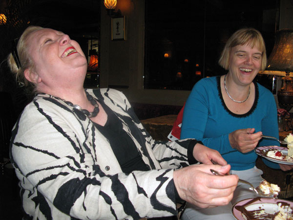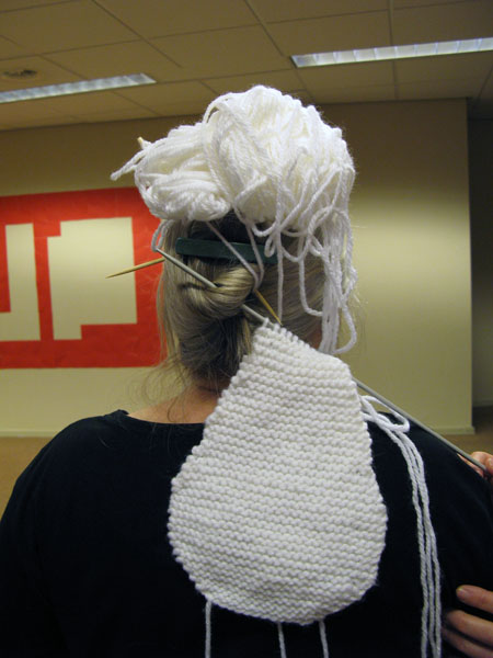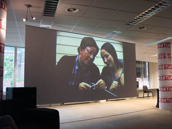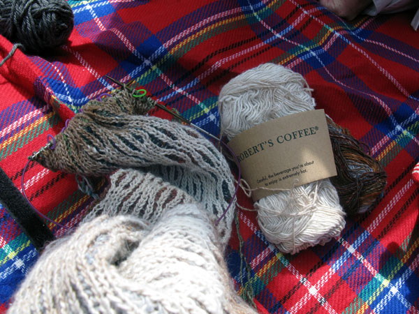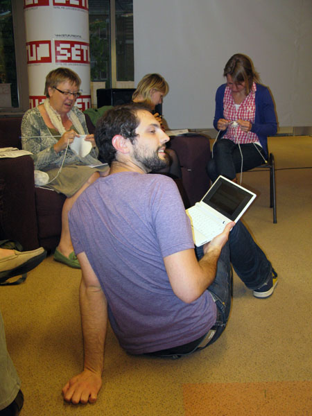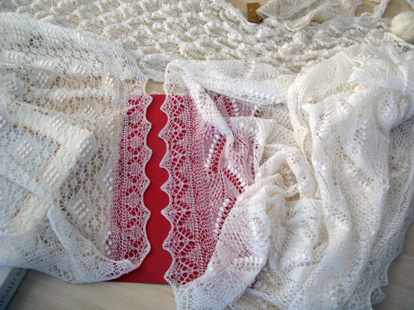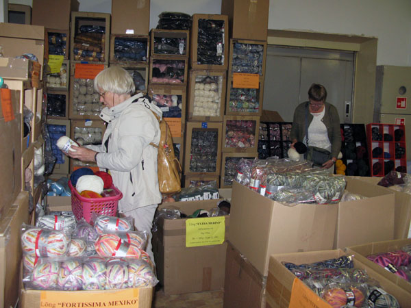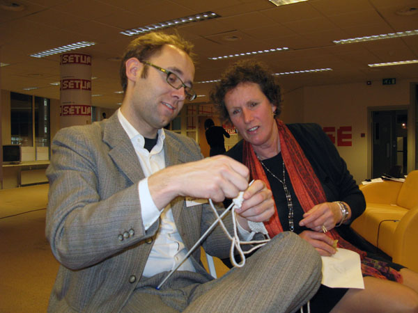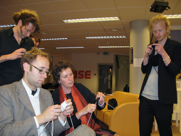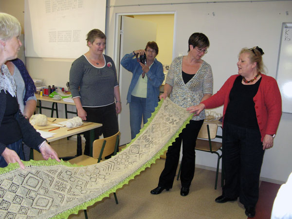Till the break they told us about thehistory of the shawls and examples were shown. Then we started casting on a mini-shawl with the original yarn. For some of us a piece of cake, but the beginning lace knitters had a rough time. But everyone got through the assignments in the end. Even Jans. Aime and Siiri thought Hil and I were dull students because we needed little guidance, but when, after the brake, we started to ask questions very thoroughly about the tiniest details they understood that we grabbed the chance to perfect our own workshops. And because they are perfectionists themselves they didn’t mind at all but just liked it. Fortunately almost no adjustments are necessary so our students of the Estonian Lace workshop can rest assured.